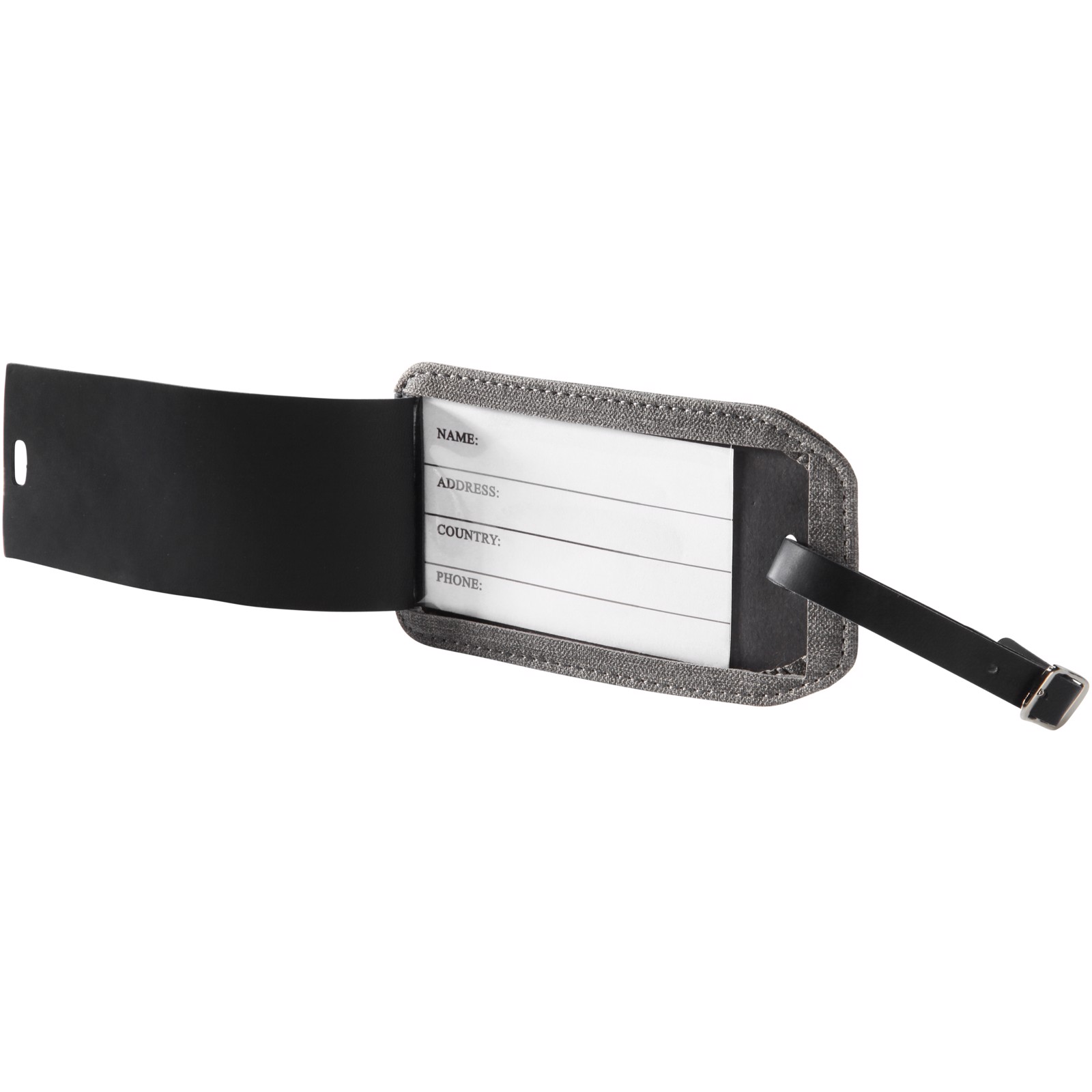 Štítek na zavazadlo. Odklápěcí identifikační štítek s popruhem. Uvnitř obsahuje ID popisek. Termo PU.
