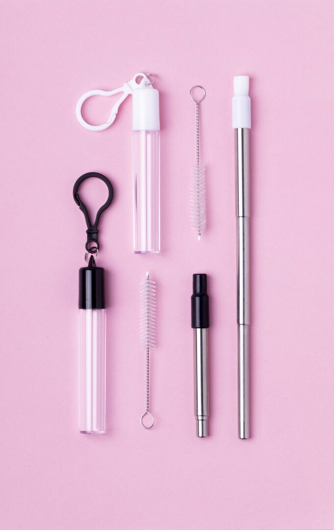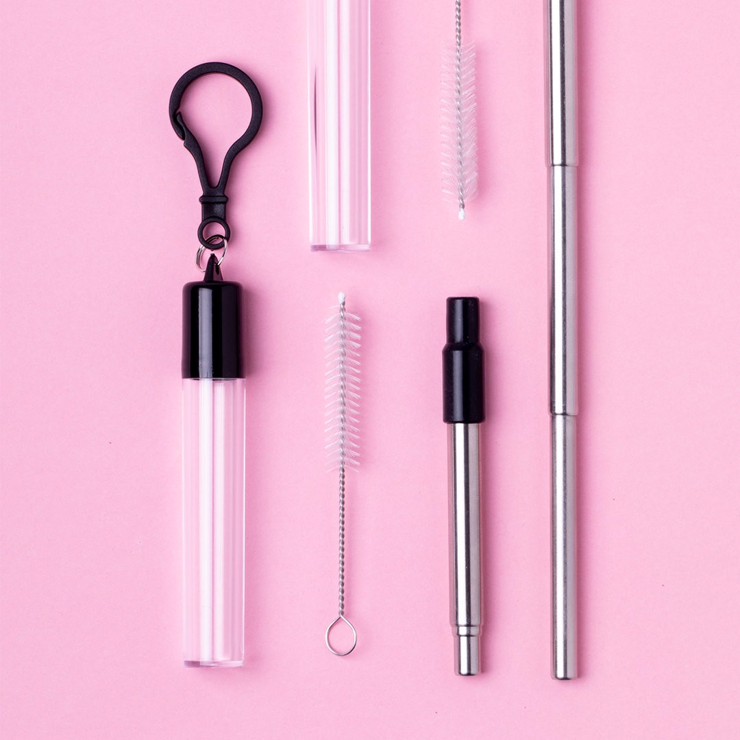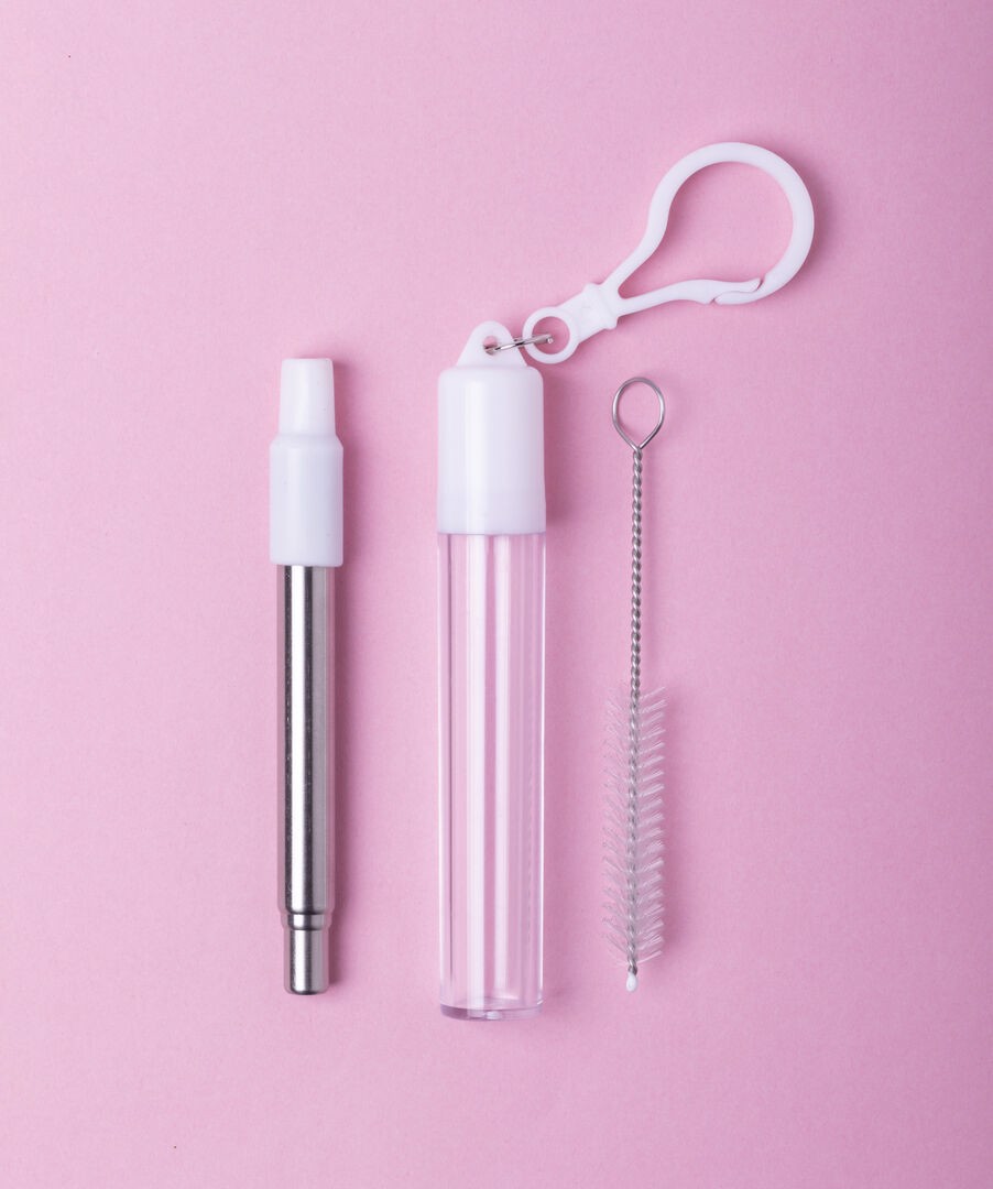 Reusable and extensible straw in stainless steel material with silicone tip. Including cleaning accessory and presented in a transparent case with carrying accessory. Extendable. Reusable. Cleaner Included