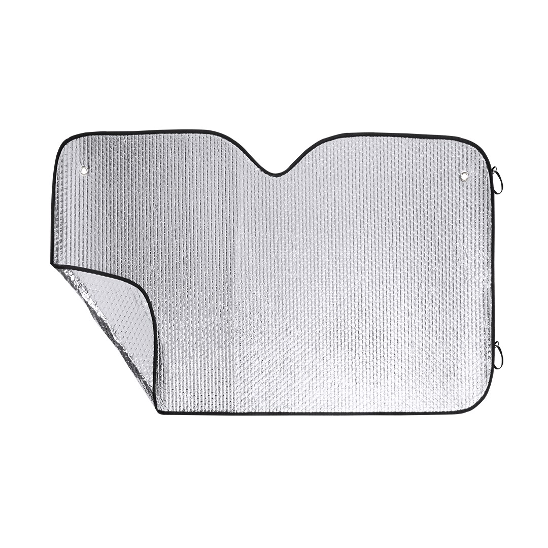 Aluminum sunshade with bubble on both sides in silver metallic finish with black piping. Size 130x80cm, with metal reinforcement rings, elastic straps for folding, two suction cups for adjustment and presentation unfolded for easy printing.