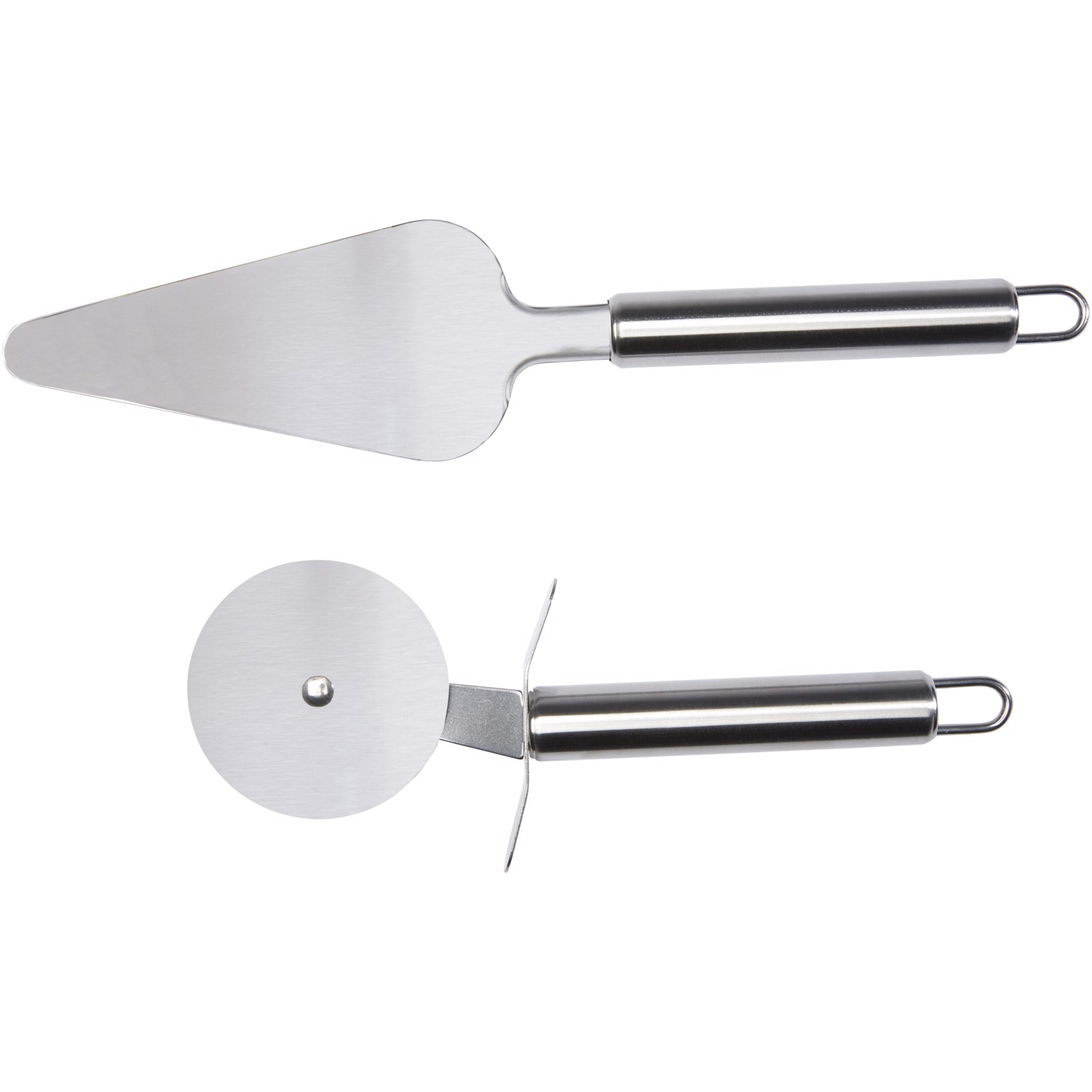 Pizza set featuring a pizza cutter and pizza spatula, also suitable for slicing and serving pies, waffles, and dough cookies, making it the perfect kitchen accessory. The spatula has a triangular cone shape with a large anti-slip surface. For safe handling the cutter has a built-in finger guard to protect hands from injury. Both tools are equipped with ergonomic handles for a comfortable grip, and at the bottom of the handles there is a hole making it easy to hang the tools on the wall to save space in the kitchen drawers.