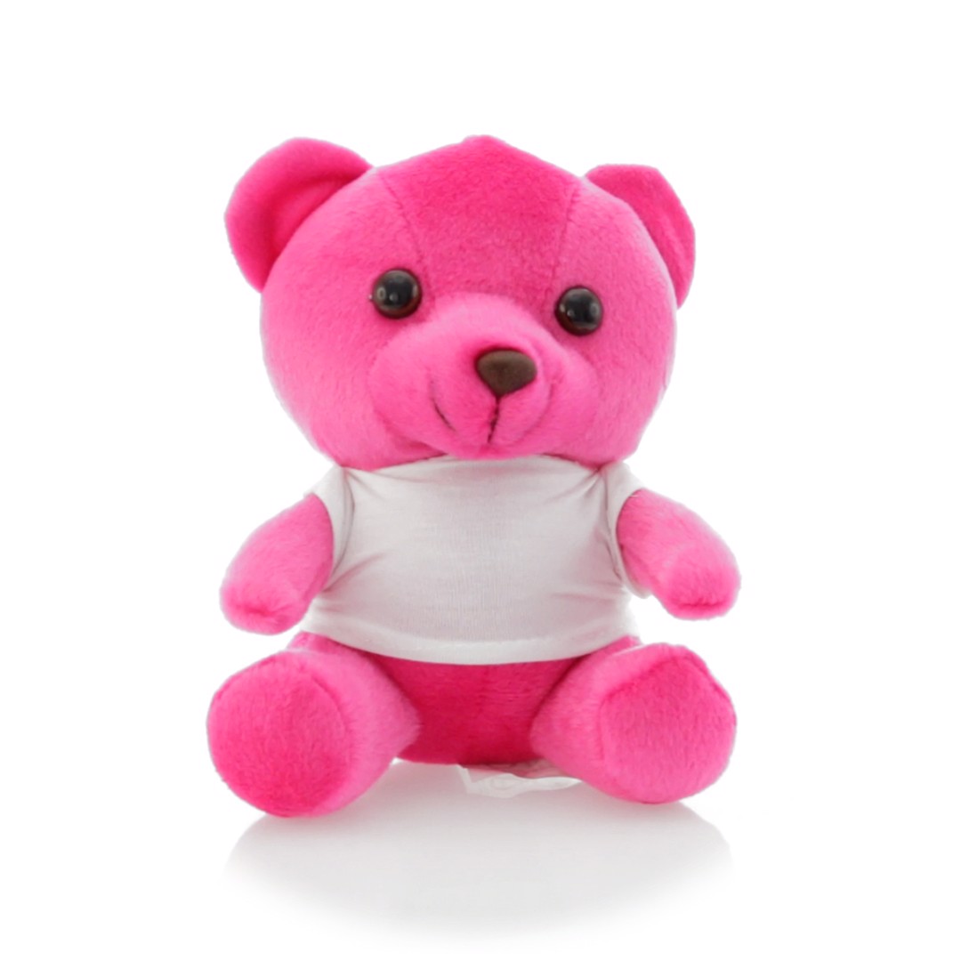Teddy bear in a fun range of bright tones with white t-shirt.