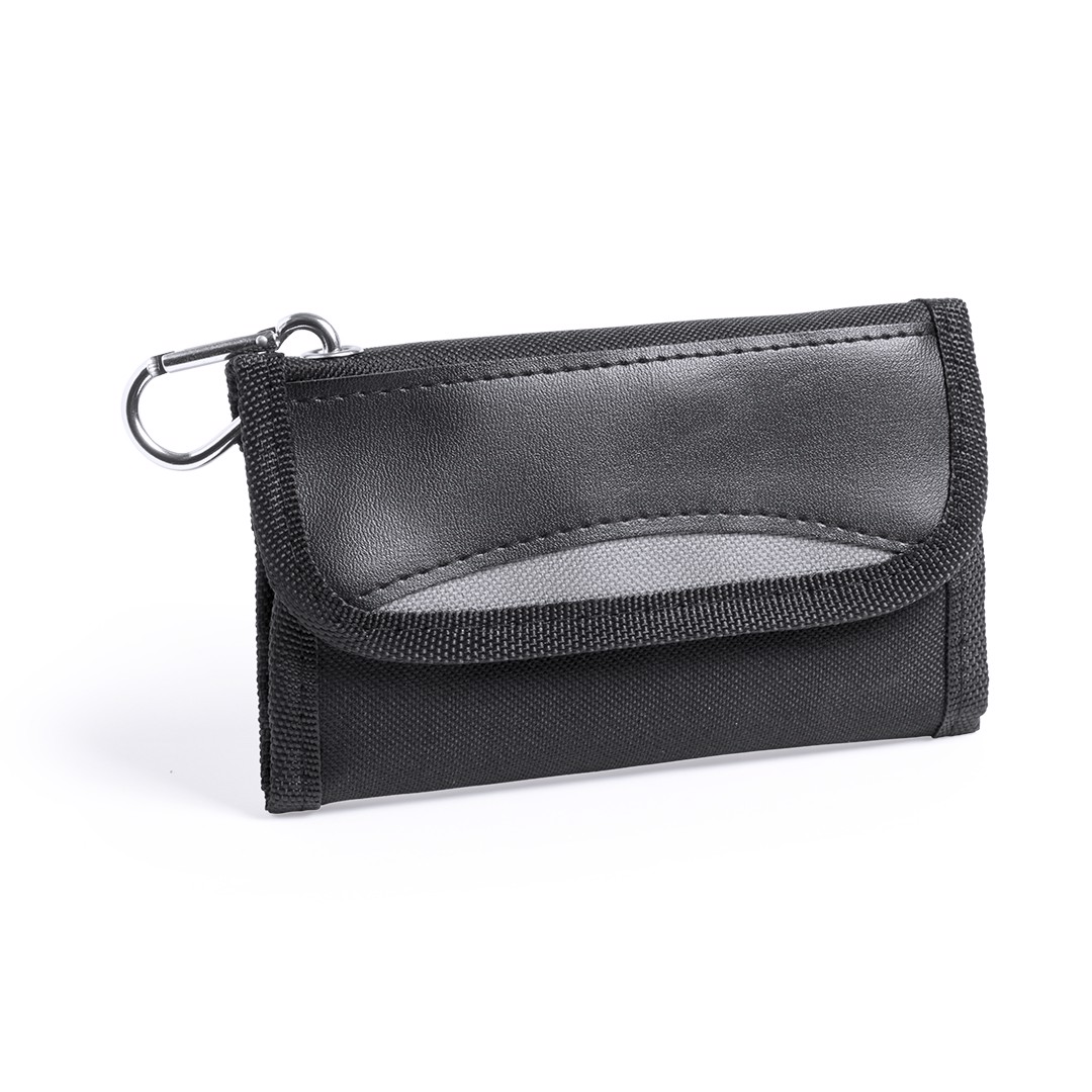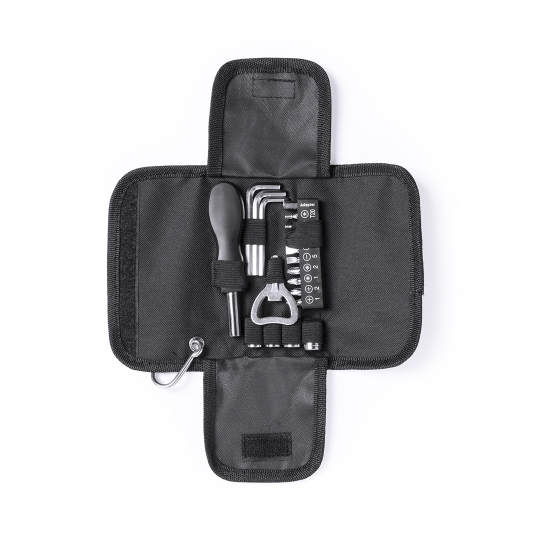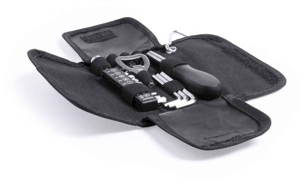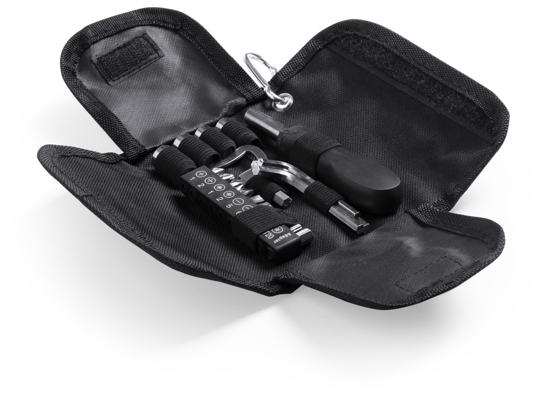 Tool set of 19 accessories in resistant polyester case with zipper closure. Includes mounting tool, flat screwdriver heads, crosshead and torx type, set of allen keys, wrenches for hexagonal nuts and opener. With metallic carrying carabiner. 19 Accessories
