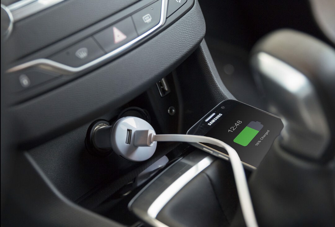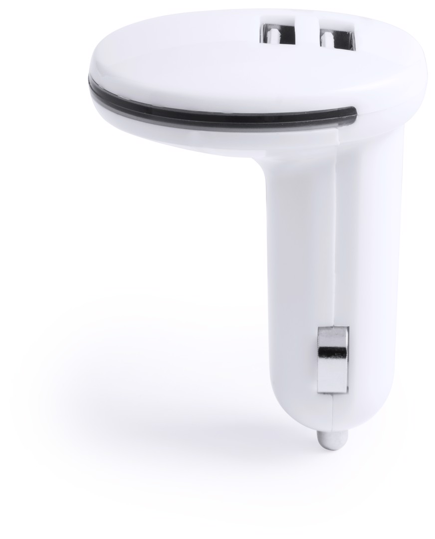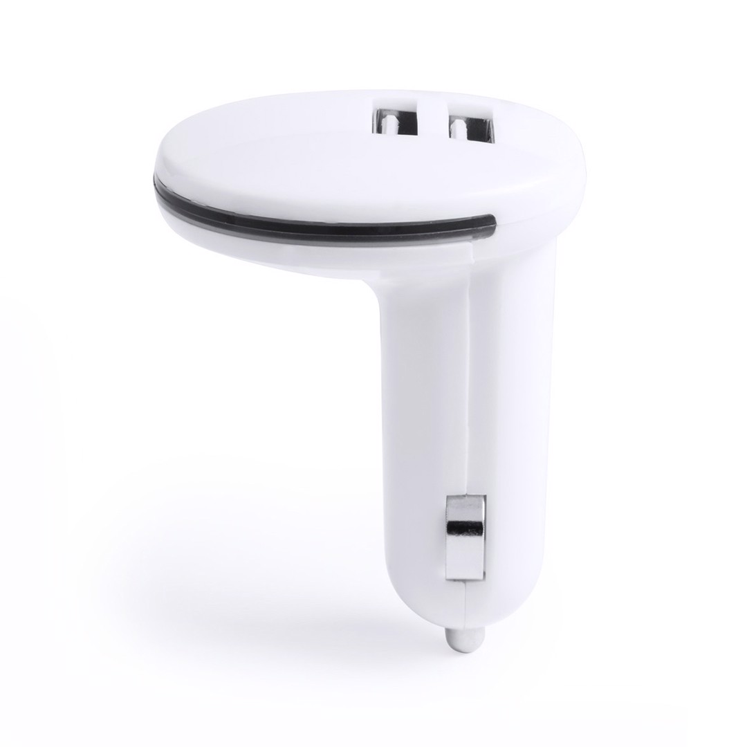USB charger for car lighter. 2,100 mA charging capacity in minimalist white color design. With dual USB output which allows simultaneous charging of two mobile devices. Presented in an individual box. 2 USB Outputs. 2100 mA