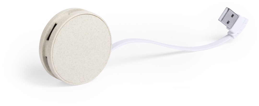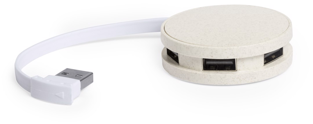 Nature line, original and compact USB hub in rounded shape. In wheat straw, to encourage the use of natural raw materials and reducing contaminant emissions, with 4 USB 2.0 ports to connect multiple devices, with a wide printing area. Presented in an individual, eco design box. 4 Hubs. USB 2.0