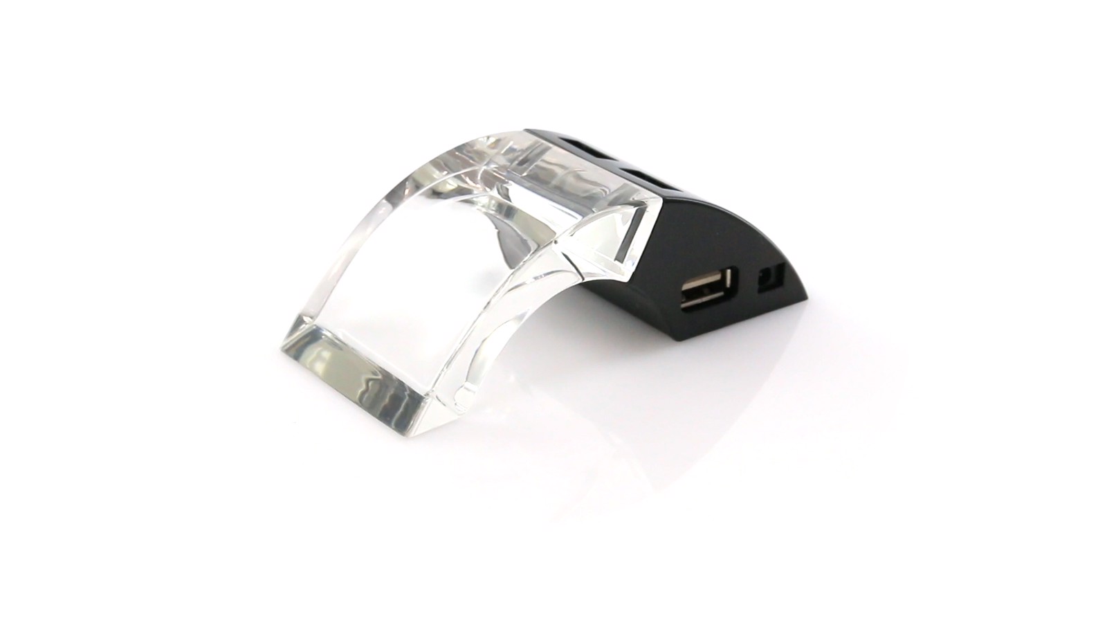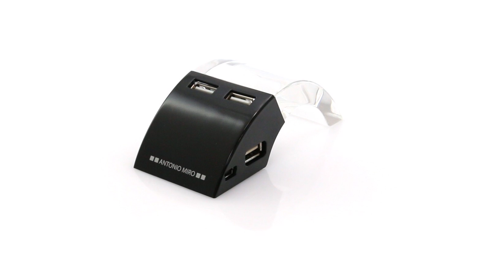 USB hub by Antonio Miró in sober design in black and transparent body combination. With 4 USB ports and transparent zone with multicolored LED light. With USB cable and Presented in an individual box. 4 Hubs. Multicolour Led Lighting