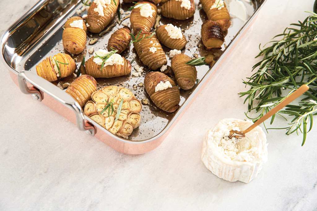 Exclusive tri-ply copper oven dish. The first layer is the copper exterior, the interior consists of a layer of aluminium and a layer of stainless steel, which make it easy to clean. The copper and aluminium layers conduct heat well, allowing the pot to heat up quickly and evenly.