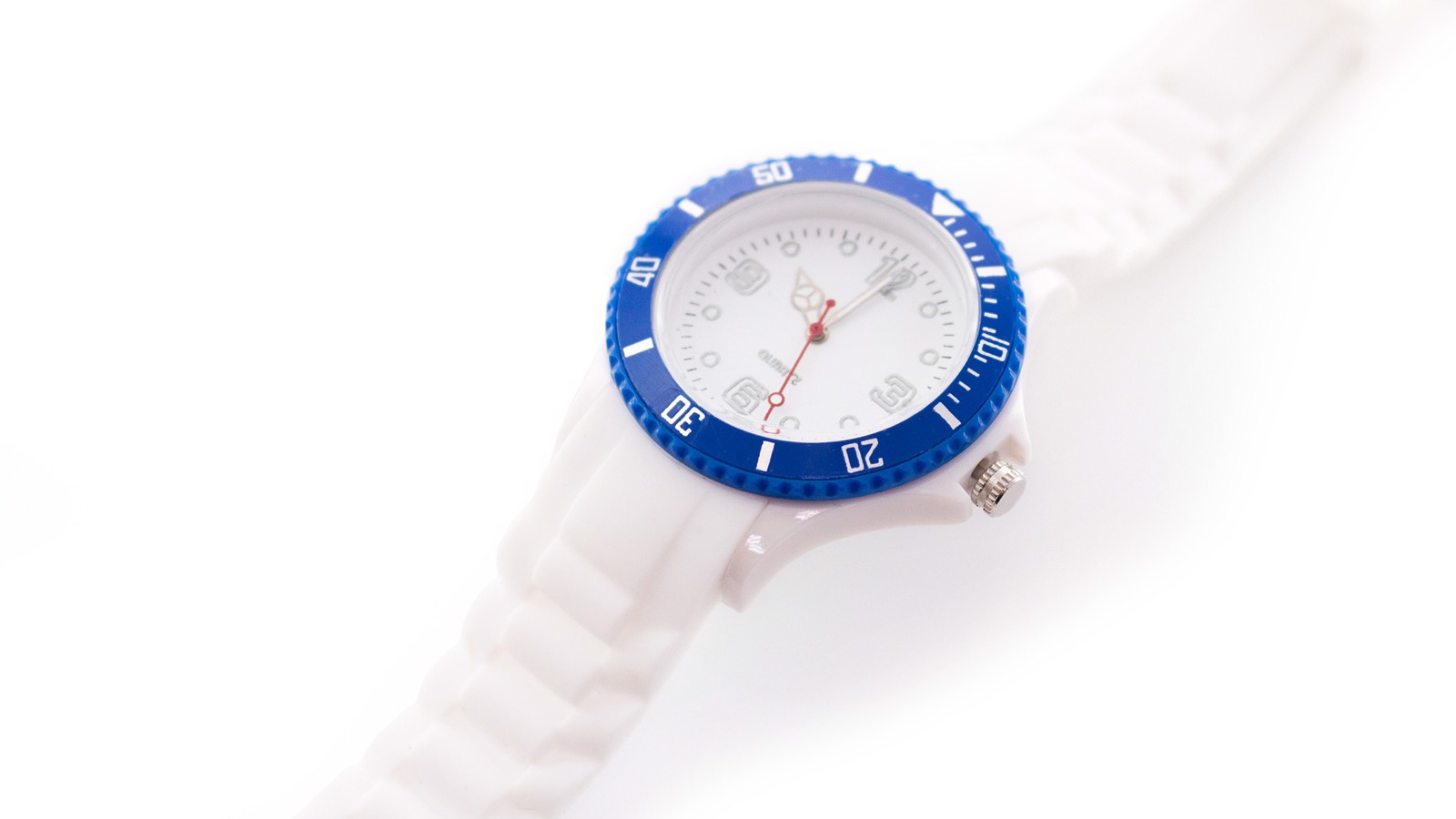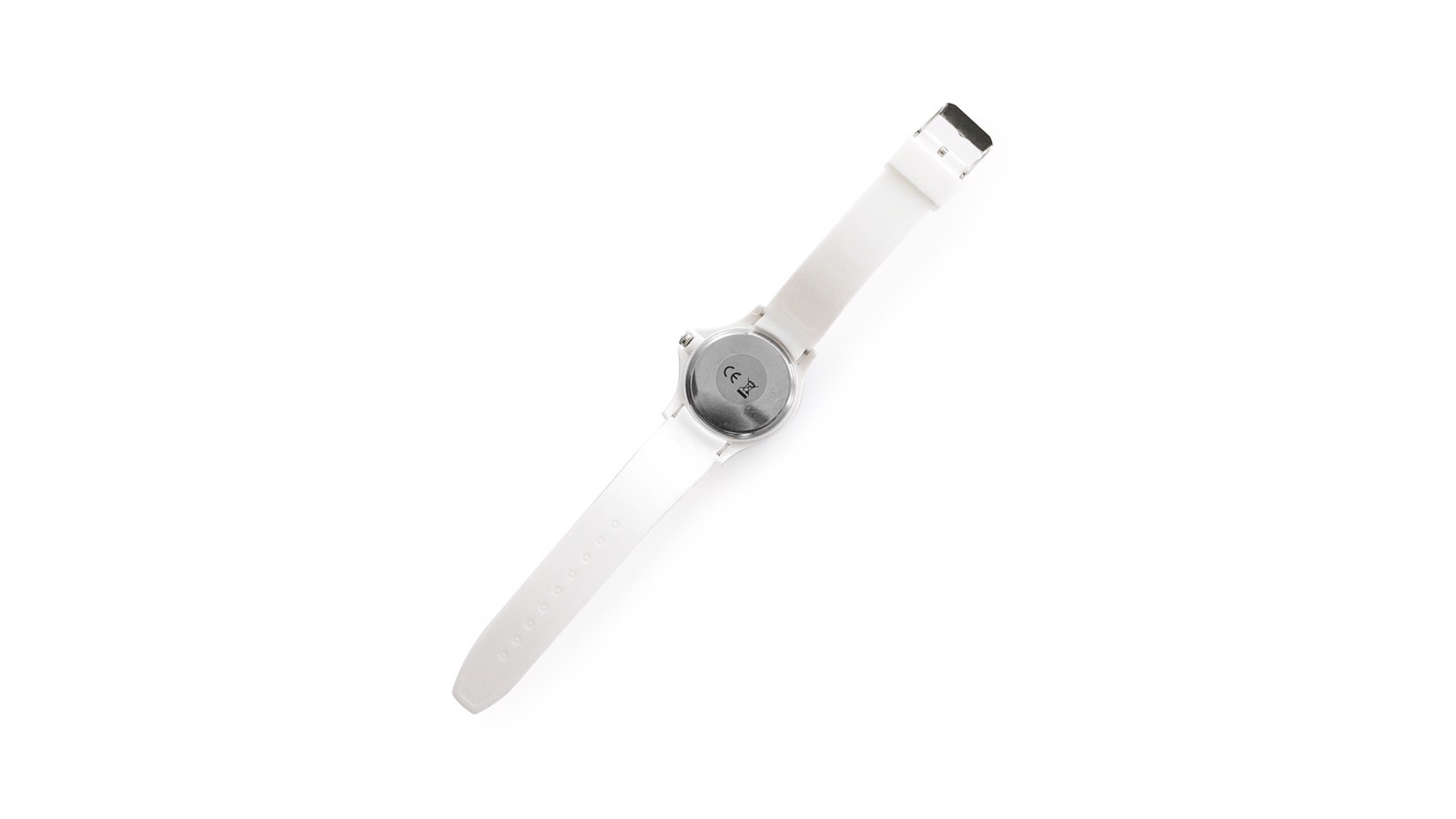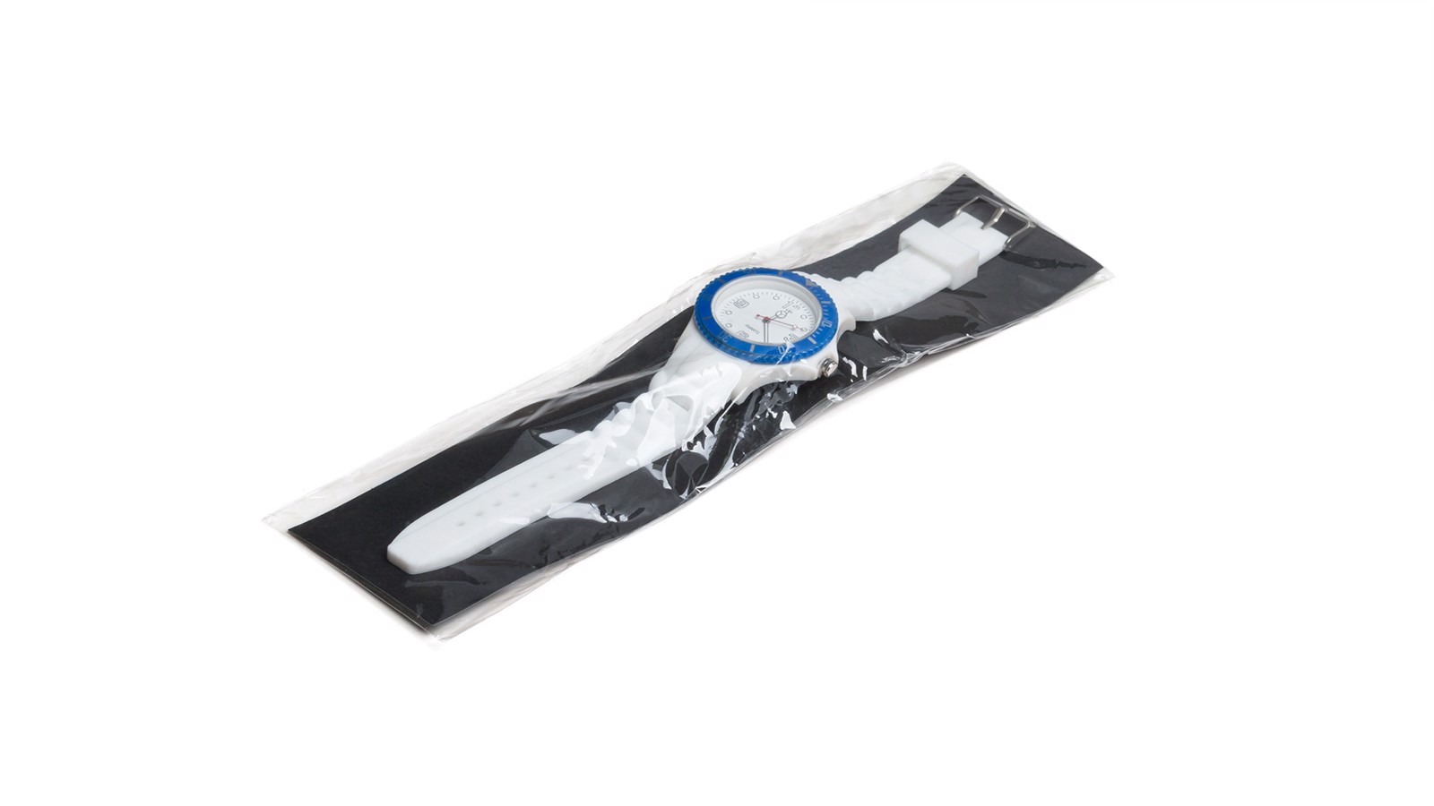 Chronograph wrist watch in an original bicolored finish. With chronograph in cheerful colors, analogue dial and with a white silicone bracelet. Resistant to water splashes. Presented in an individual bag.