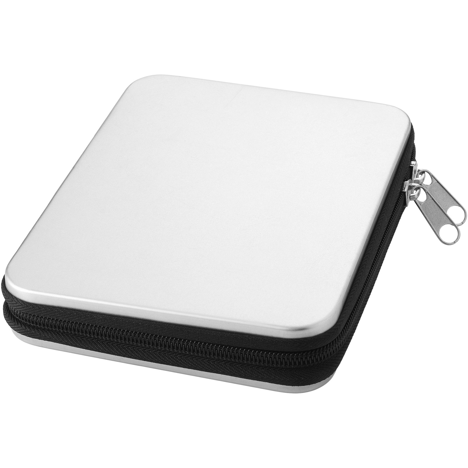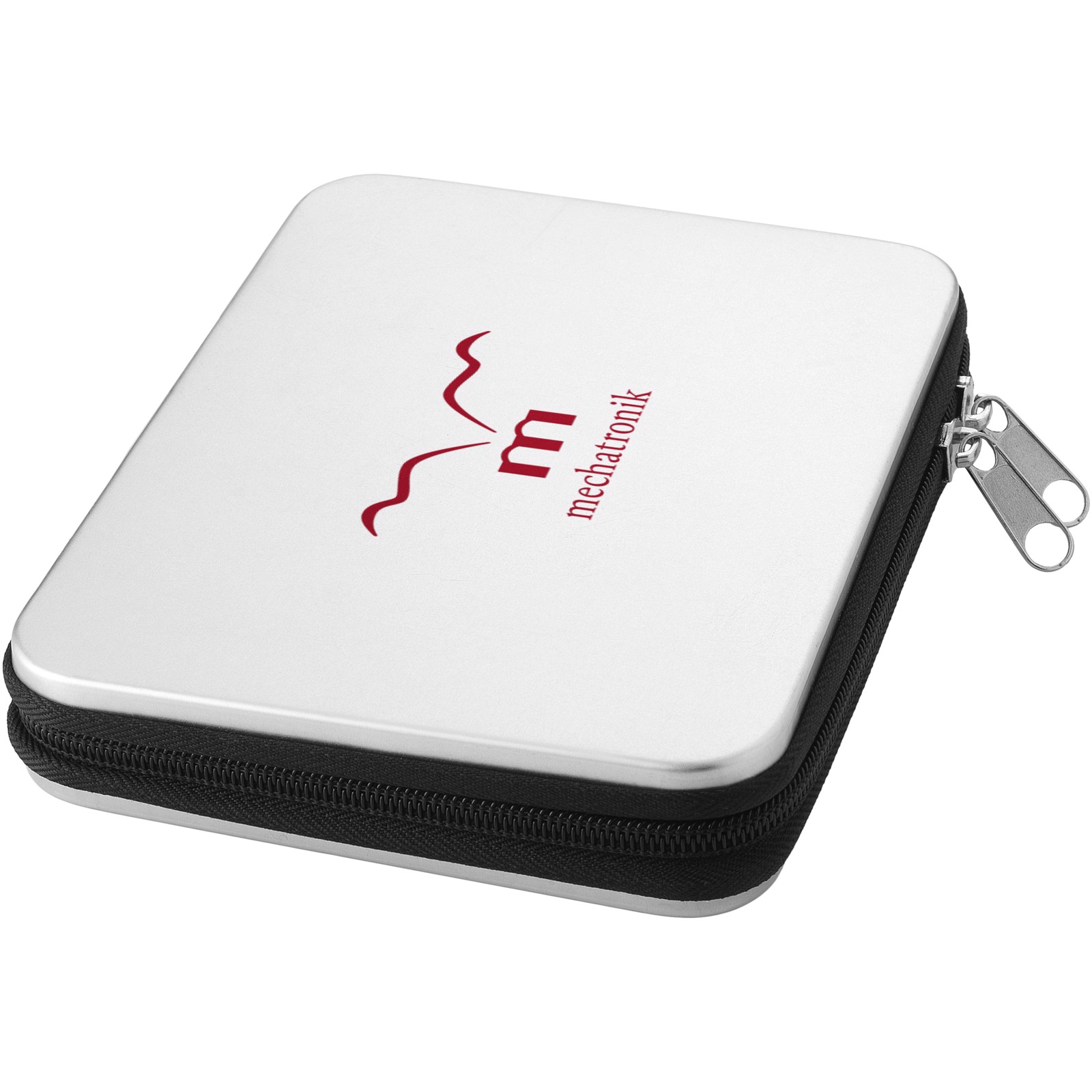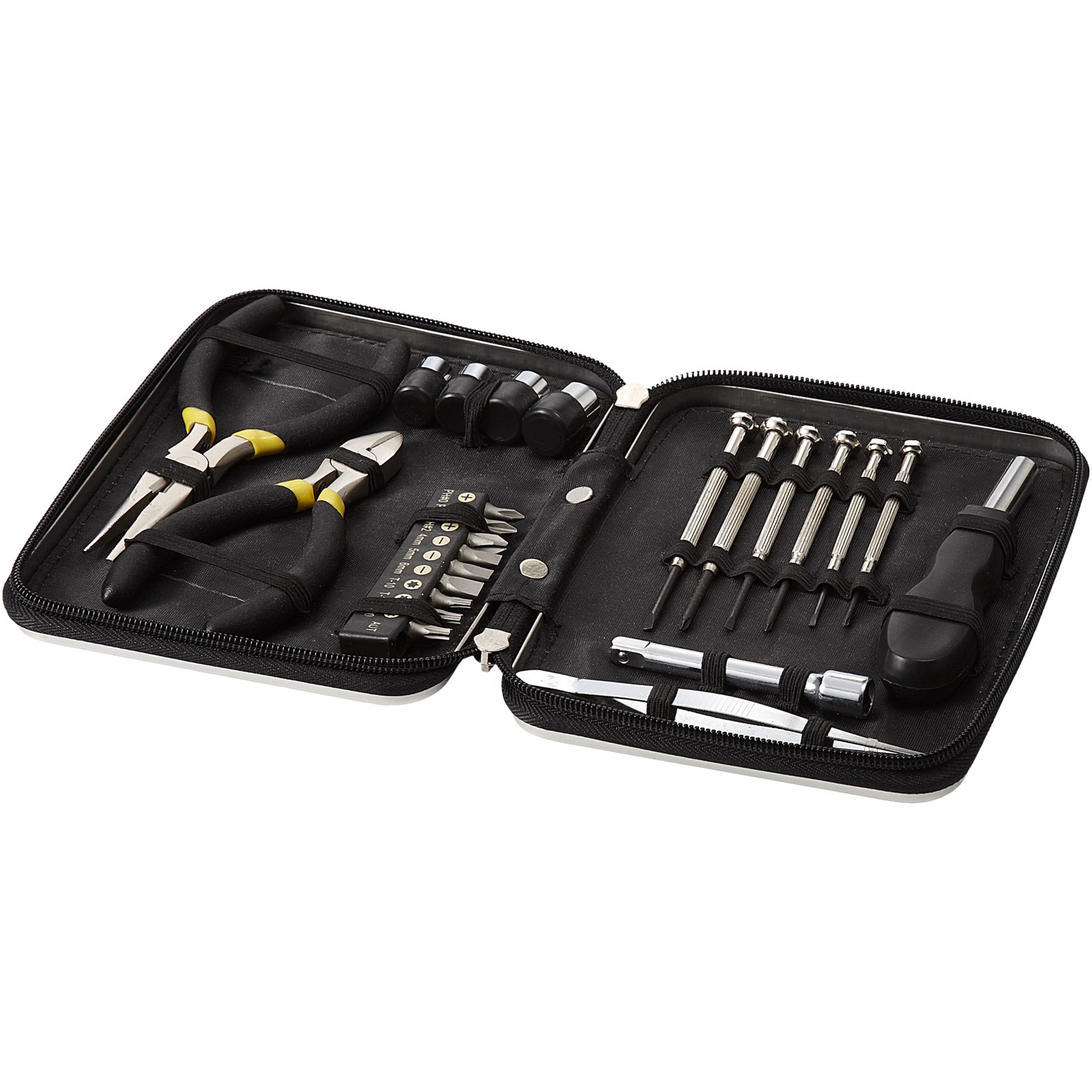 6 Schraubendreher, 10 Bits, Verbinder, 4 Steckschlüsseleinsätze, 2 Zangen und Pinzetten in einem Werkzeugkasten aus Metall.