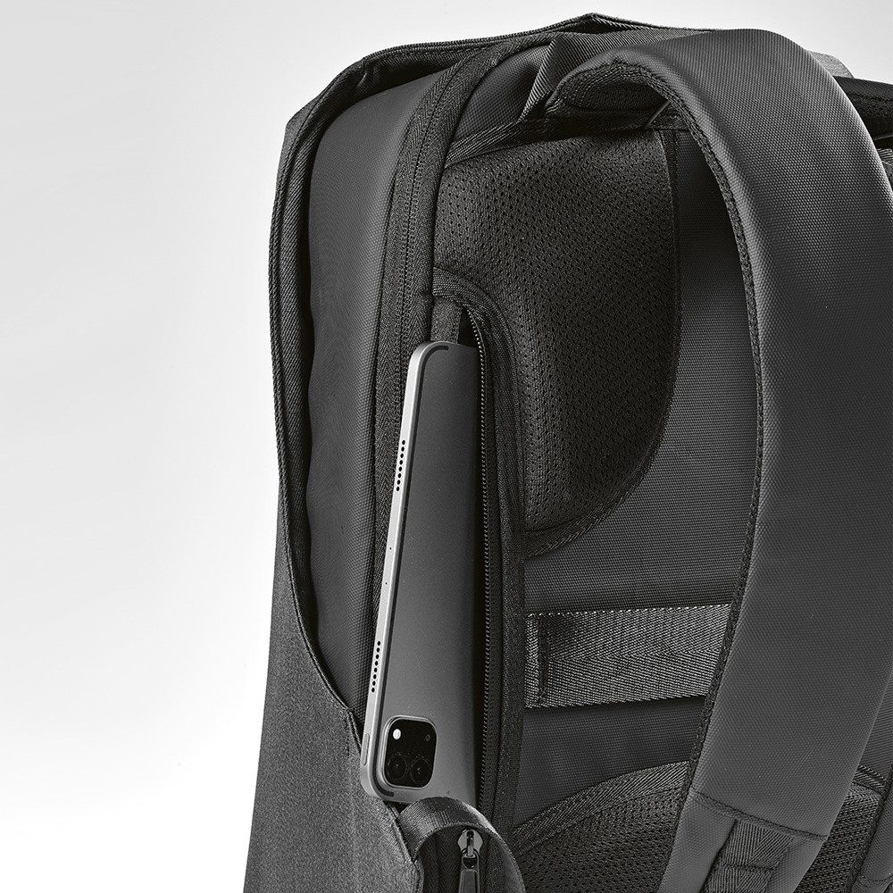 The Abrantes is a 20L backpack made from rPET with PU coating featuring a hidden TSA-approved lock. All panels have an anti-cut layer to protect the contents. Inside is a dedicated compartment for a 17" laptop, a pocket with RFID protection and a zipped compartment to separate your personal belongings. A padded lumber support, trolley strap and padded shoulder straps provide additional comfort. Presented in a recycled cotton bag and an individual kraft box.