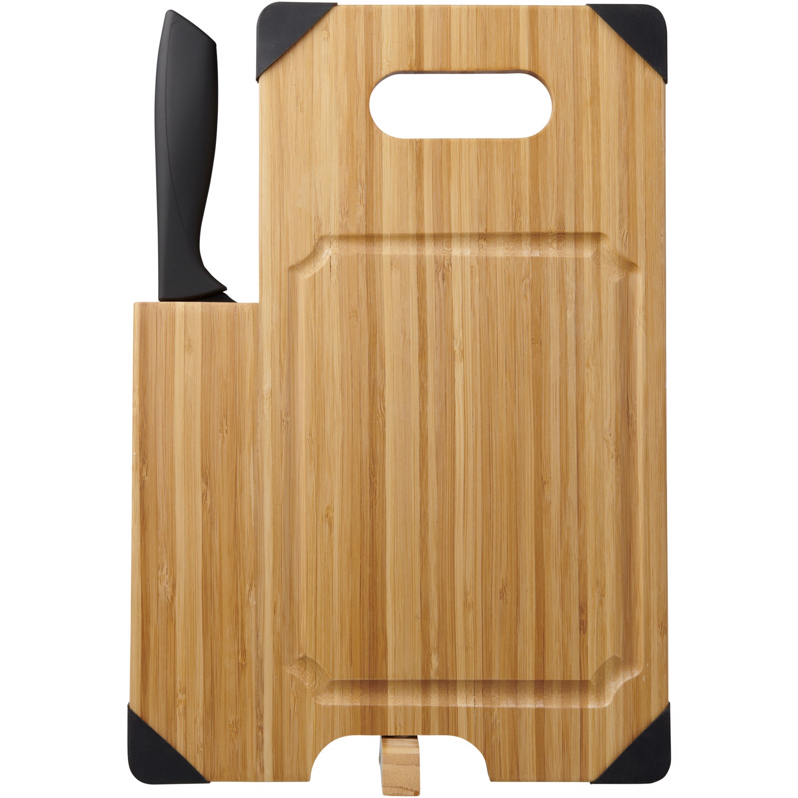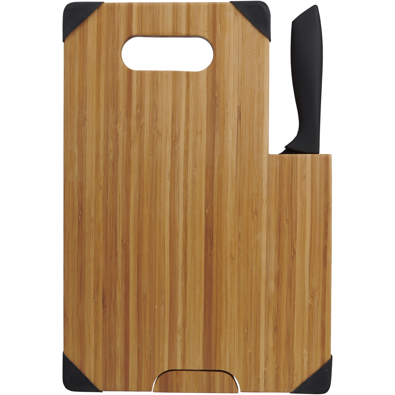 Das Bambus-Schneidebrett kommt mit einem integrierten Edelstahlmesser für alle Ihre Schneideaufgaben. Die darunter liegenden Silikonpads halten das Schneidbrett während des Schneidens sicher in Position.