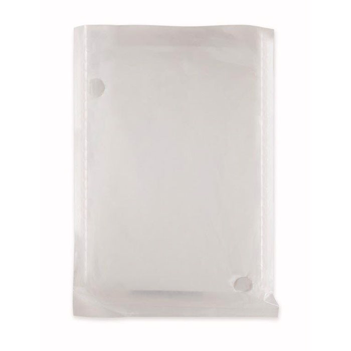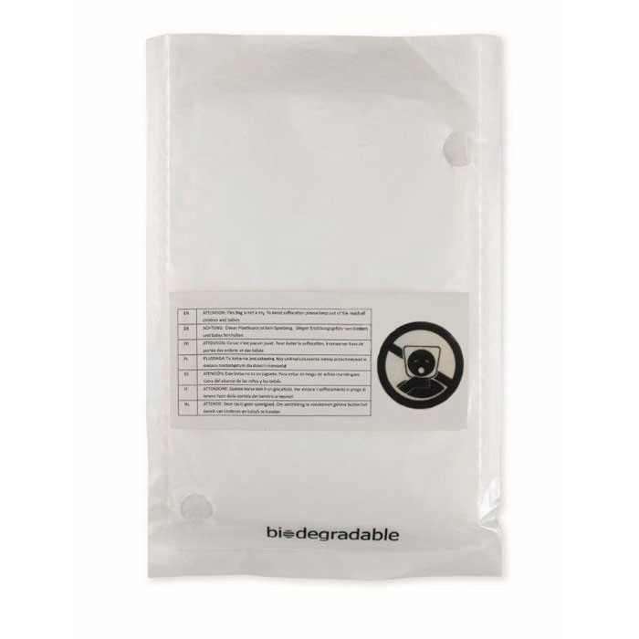 Regenmantel mit Kapuze. Praktisch, klein gefaltet. Verpackt in einem transparenten Polybeutel. Mantel und Polybeutel aus natürlich abbaubarem PLA (auf Maisbasis).