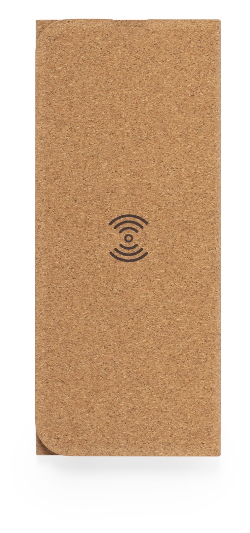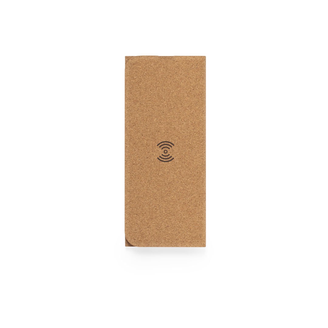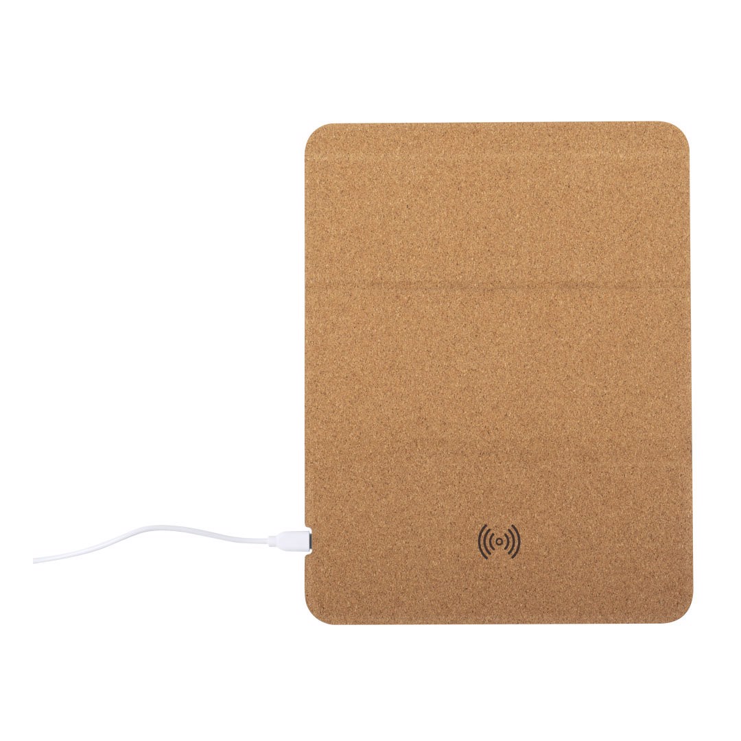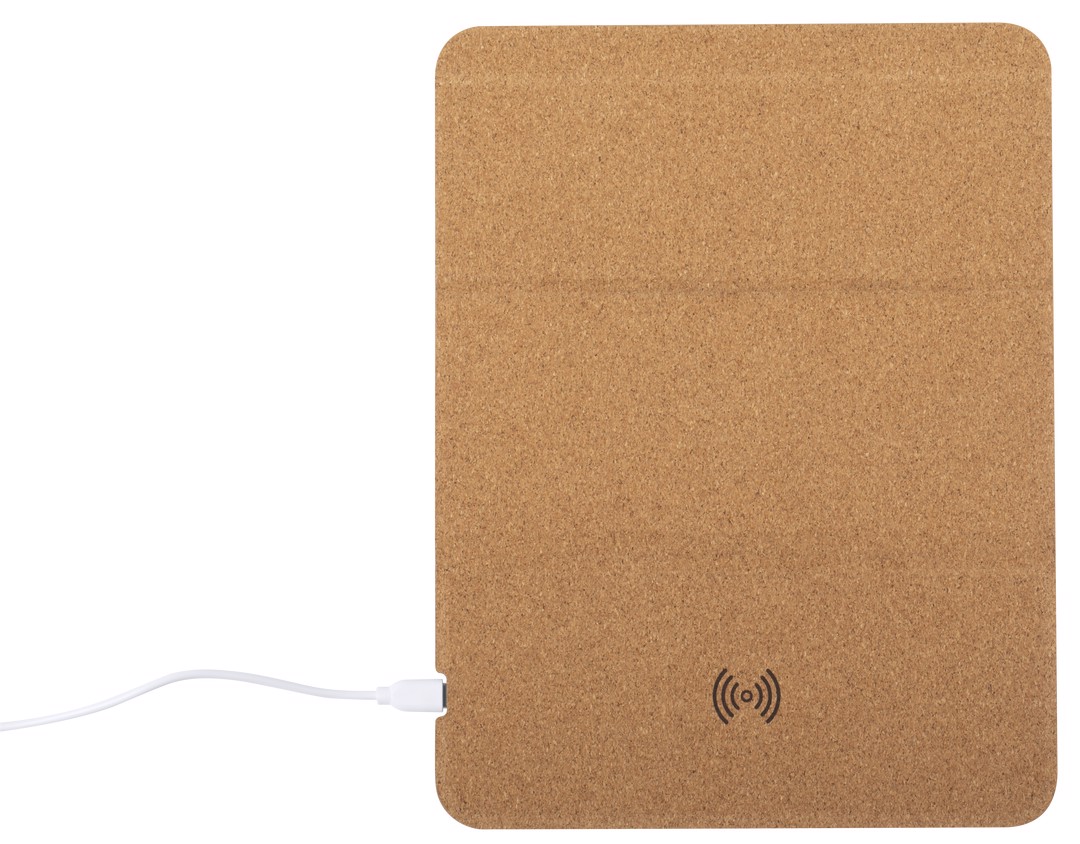 Nature line mousepad with built-in, wireless, charger. Made of natural cork, with Type C cable included-, non-slip base and integrated smartphone holder. Compatible with devices equipped with wireless charging technology and presented in an individual eco design box. Wireless. Cable Included