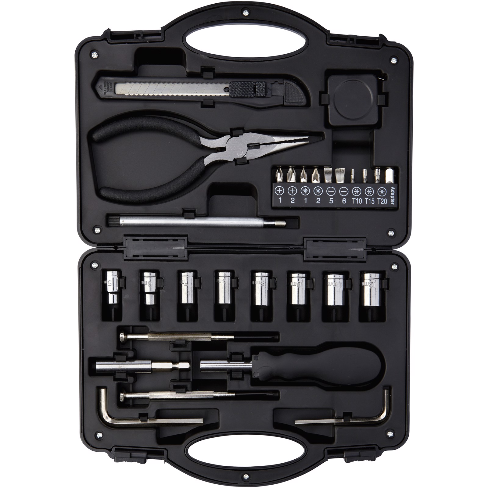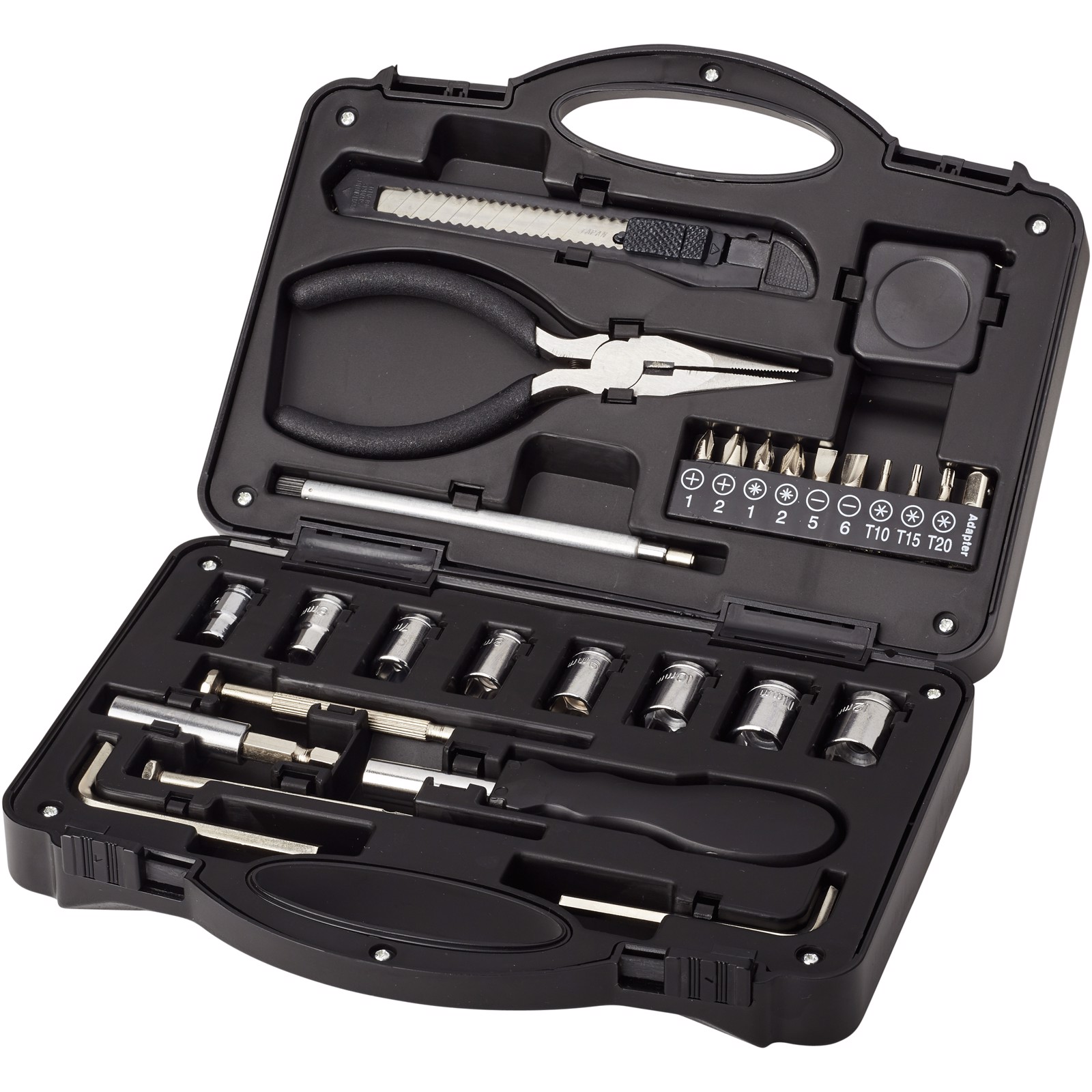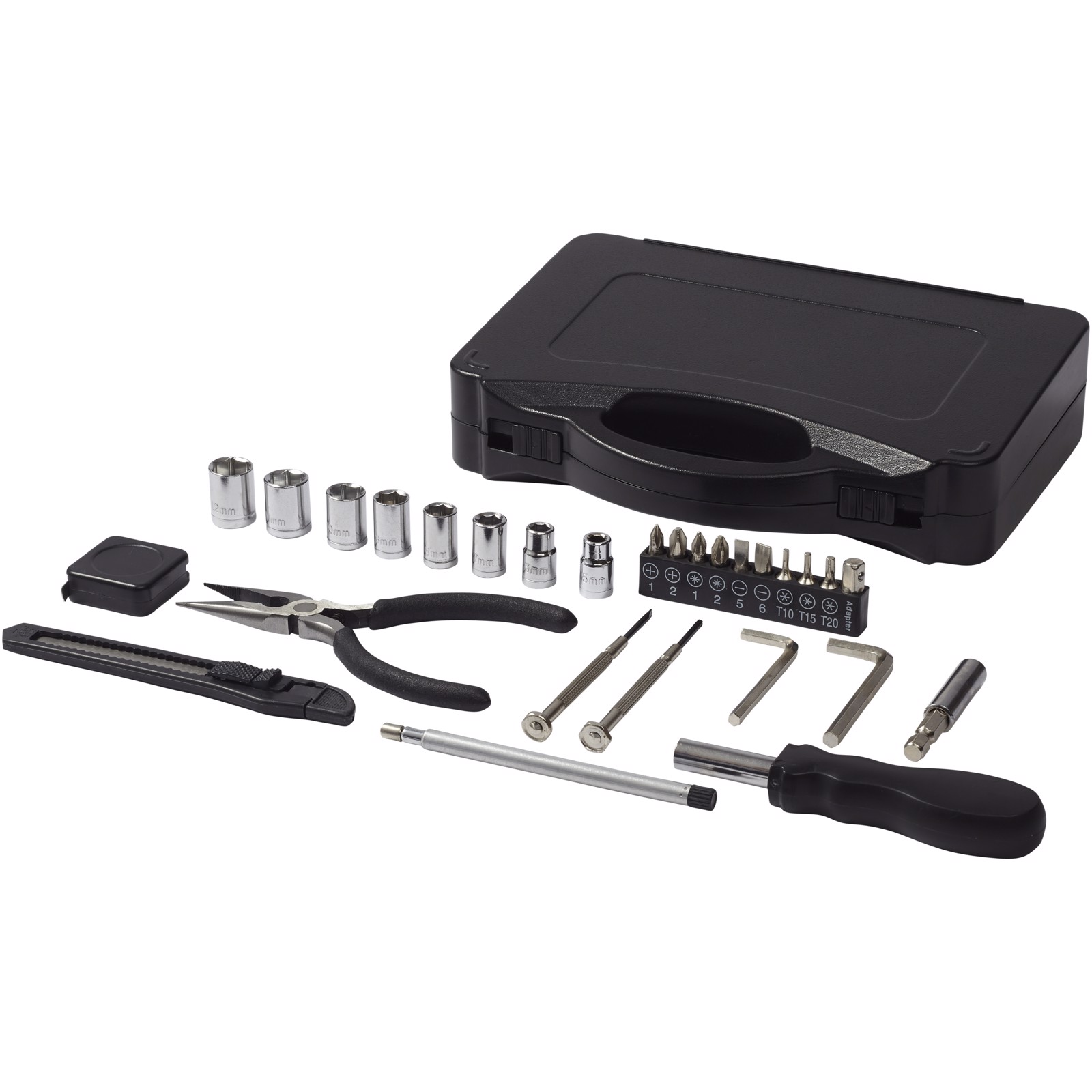 Dieses 28 teilige Werkzeugset im Kasten besteht aus einem Schraubendrehergriff mit 9 Schraubendreherbits (PH1, PH2, PZ1, PZ2, SL5, SL6, T10, T15, T20), einem Verlängerungsadapter, einem Steckschlüsseladapter, 8 Steckschlüsseln (5mm, 6mm, 7mm, 8mm, 9mm, 10mm, 11mm, 12mm), einem ausziehbaren Universalmesser, einer langen Spitzzange, einem teleskopischen Magnetaufnahmewerkzeug, 2 Sechskantschlüsseln (4mm, 5mm), 2 Präzisionsschraubendrehern (PH2, SL2) und 1 Maßband. Verpackt in einer STAC Geschenkbox.