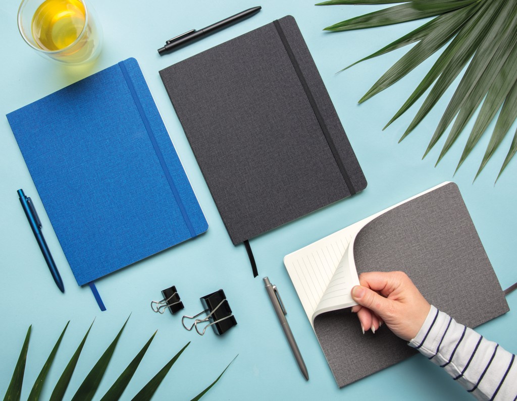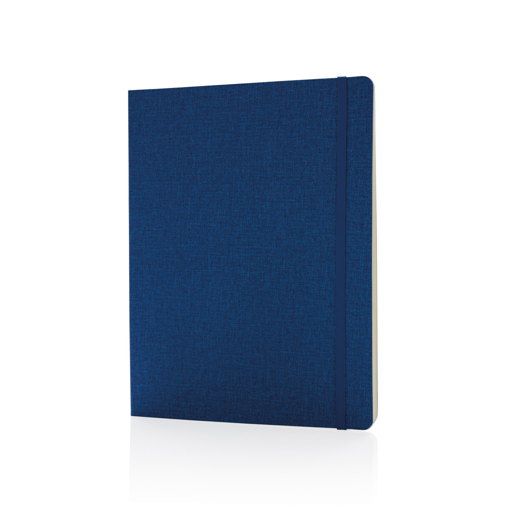 Flexibles Softcover Notizbuch im B5 Format, 19x25cm. Mit elastischem Verschlußband, Seitentrenner und rückseitiger Tasche. 160 cremefarbene, linierte Seiten, 78g/qm