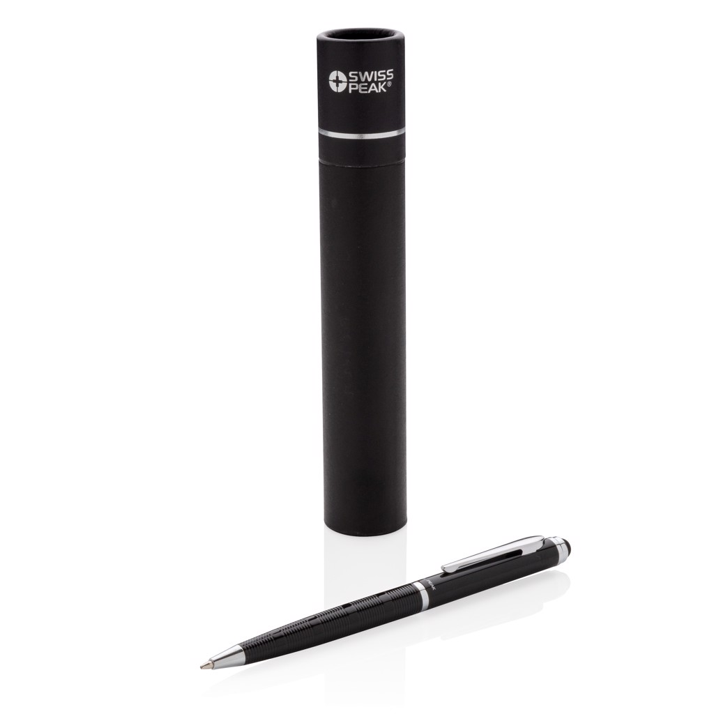 Ein besonderer Stift mit feinen Linien am Schaft. Dieser exklusive Stylus Kugelschreiber ist ein Geschenk der besonderen Art und kommt in einer Swiss Peak Röhren-Geschenkverpackung. Blau schreibend.
