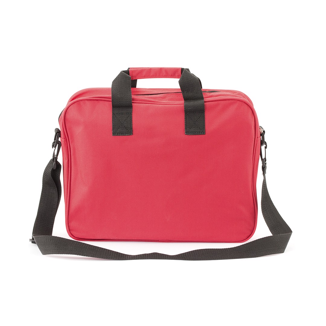 Document bag in soft 600D polyester finish in bright tones. With zipper closure and with an original front pocket in vertical. Compartment under the handles, with matching color reinforced carrying handles and adjustable shoulder strap with carabiner closures.