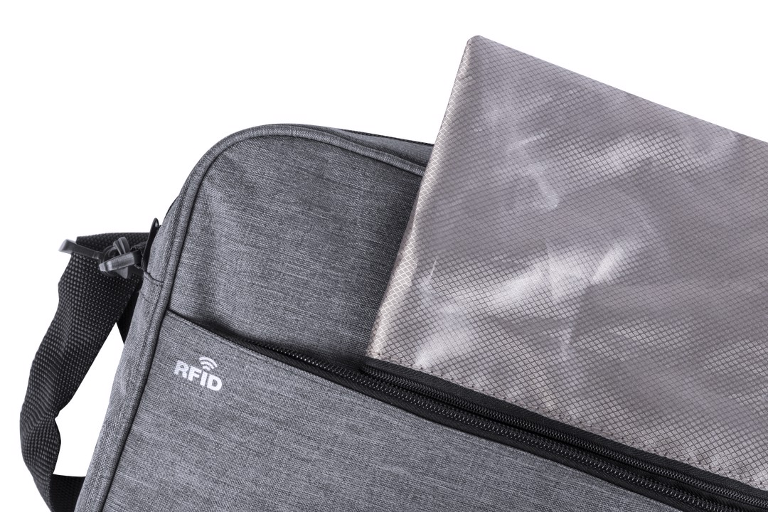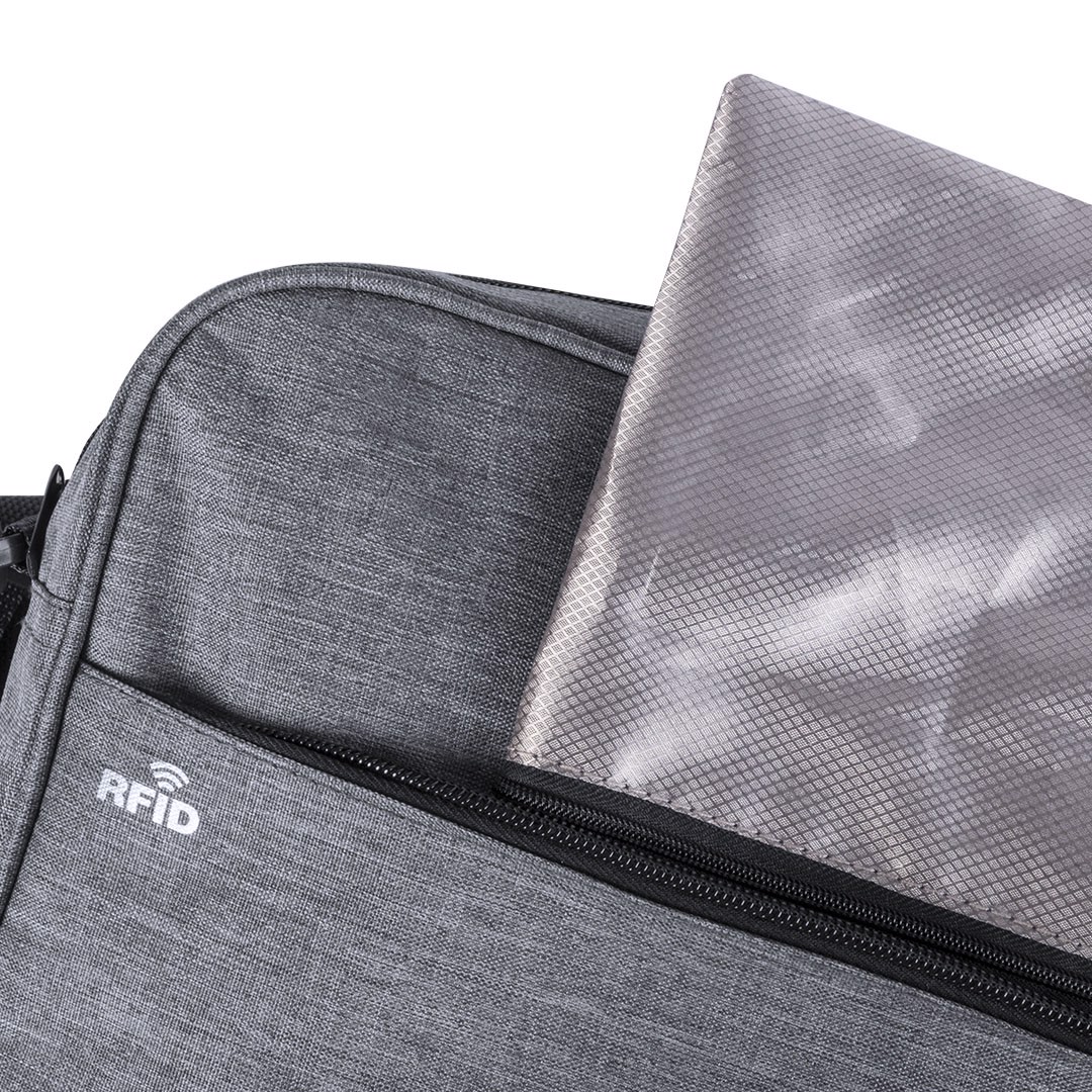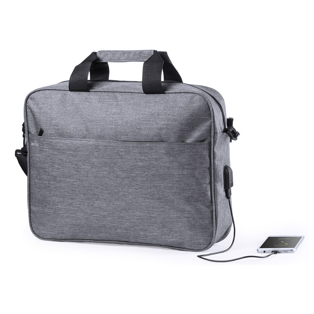 Security document bag in an urban design and in resistant 300D polyester material. Inside pocket with RFID (Radio Frequency Identification) security technology that keeps card and other devices data safe. Protected handles and main compartment with zipper closure. With USB connection -powerbank not included and inside, padded pockets for laptops up to 15 inches and tablets up to 10 inches. Adjustable shoulder strap with padded protection. RFID Protected. USB Connection. Padded Laptop and Tablet Compartment