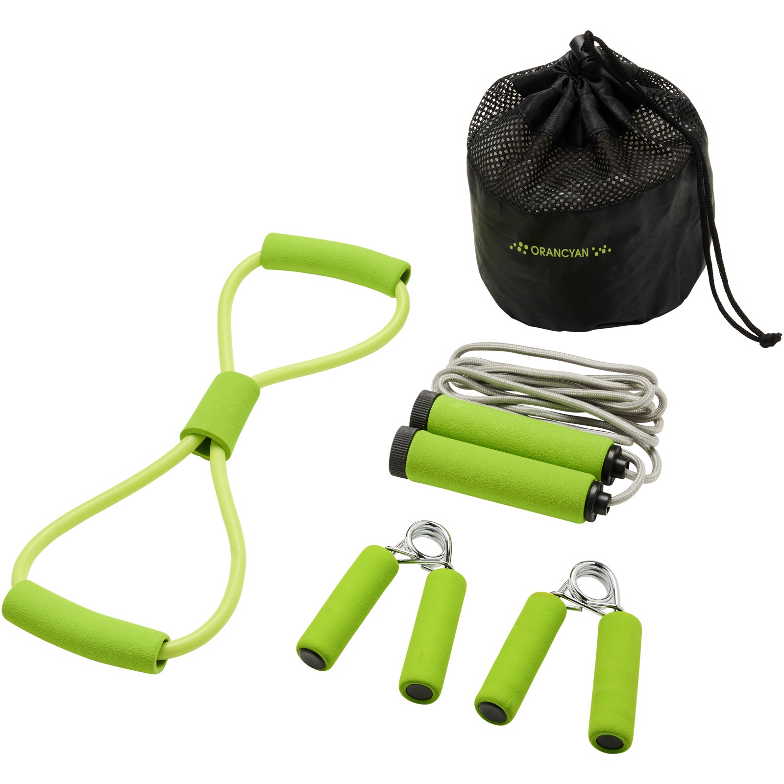 Fitness-Set mit allen Tools für ein perfektes Training. Zwei Handgrifftrainer, Springseil und Brust-Expander in farblich passendem Material. Wird in einem Netzbeutel für einfaches Tragen geliefert und hat eine große Dekorationsfläche.