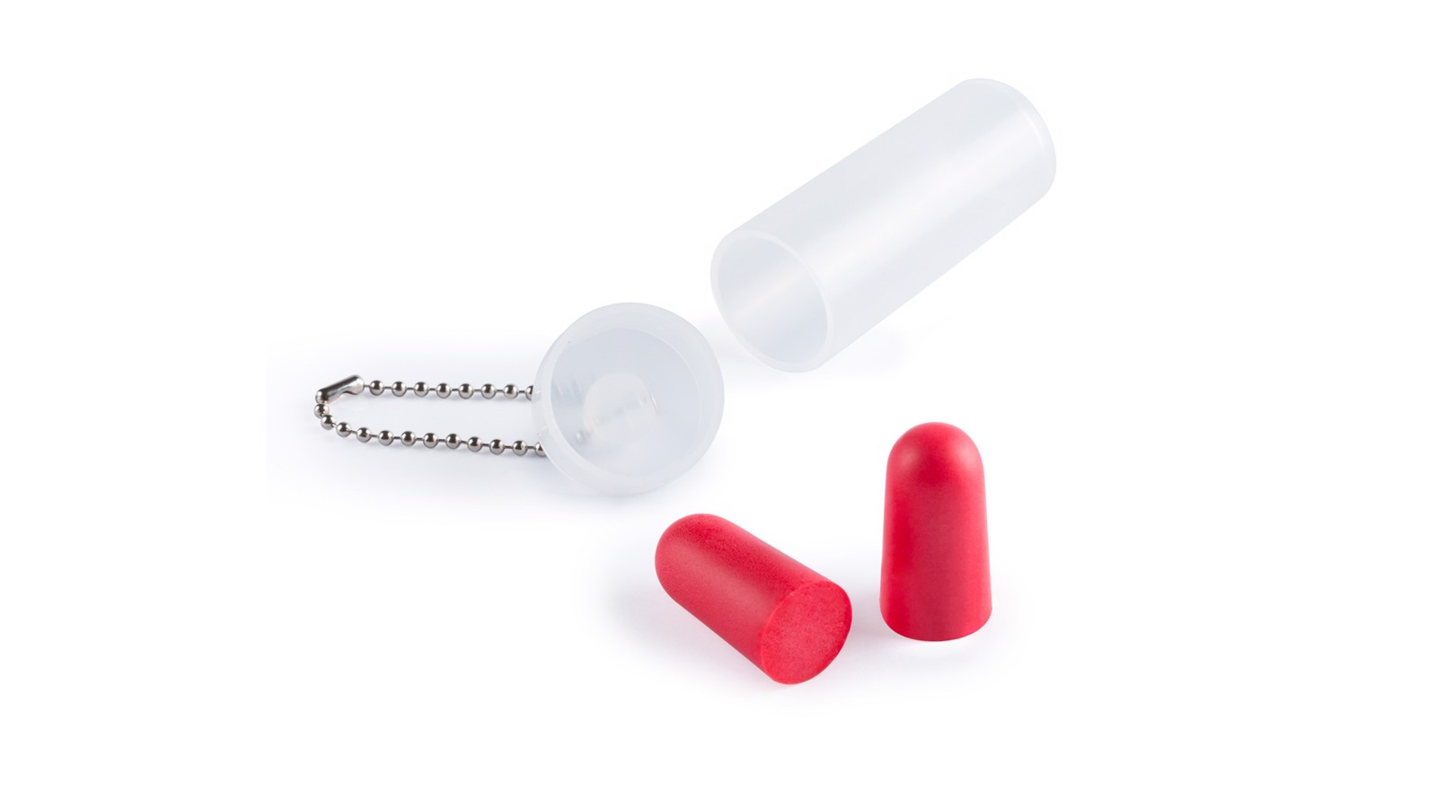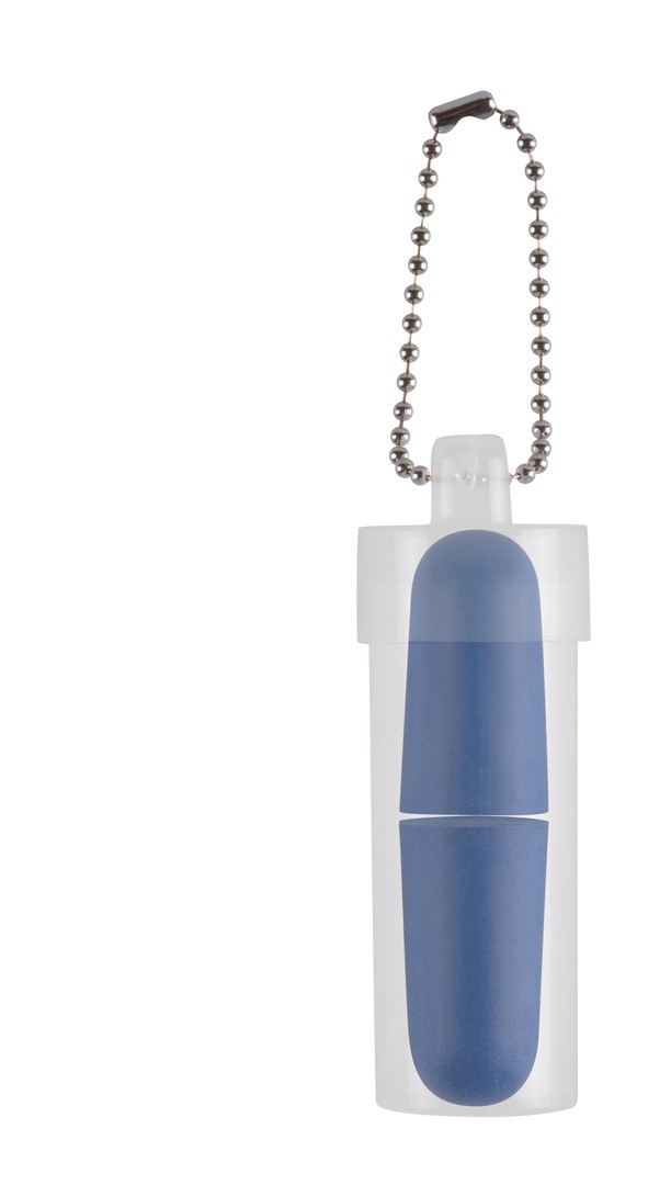 Comfortable earplugs in brightly colored EVA material. Presented in an individual, transparent case with carrying chain.