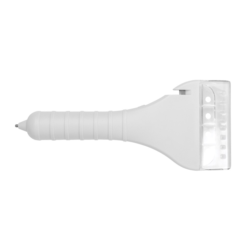Eiskratzer mit eingebautem COB-Licht, Sicherheitsgurtschneider und Scheibenhammer aus Stahl. Das Gehäuse aus ABS, das Eiskratzerteil aus PP. Lich: total 110 Lumen. Einschließlich Batterien für den direkten Gebrauch.