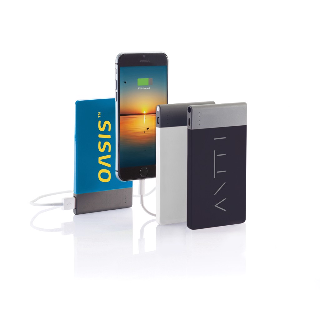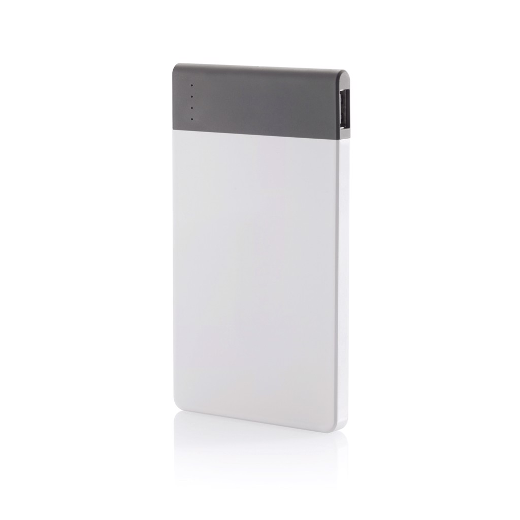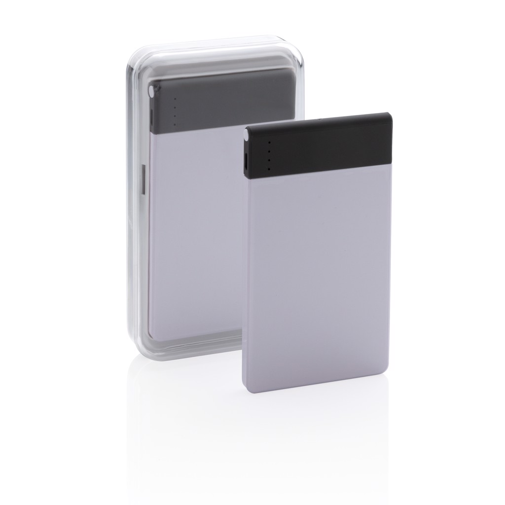 Flache 4.600 mAh Powerbank mit hochwertigem Lithium Polymer Akku. Inkl. Ein/Aus-Schalter zum Unterbrechen des Stromflusses und inkl. Ladestandsanzeige. Output 5V/2.1A, Input 5V/1A. Konfektoniert in transparenter Geschenkbox.