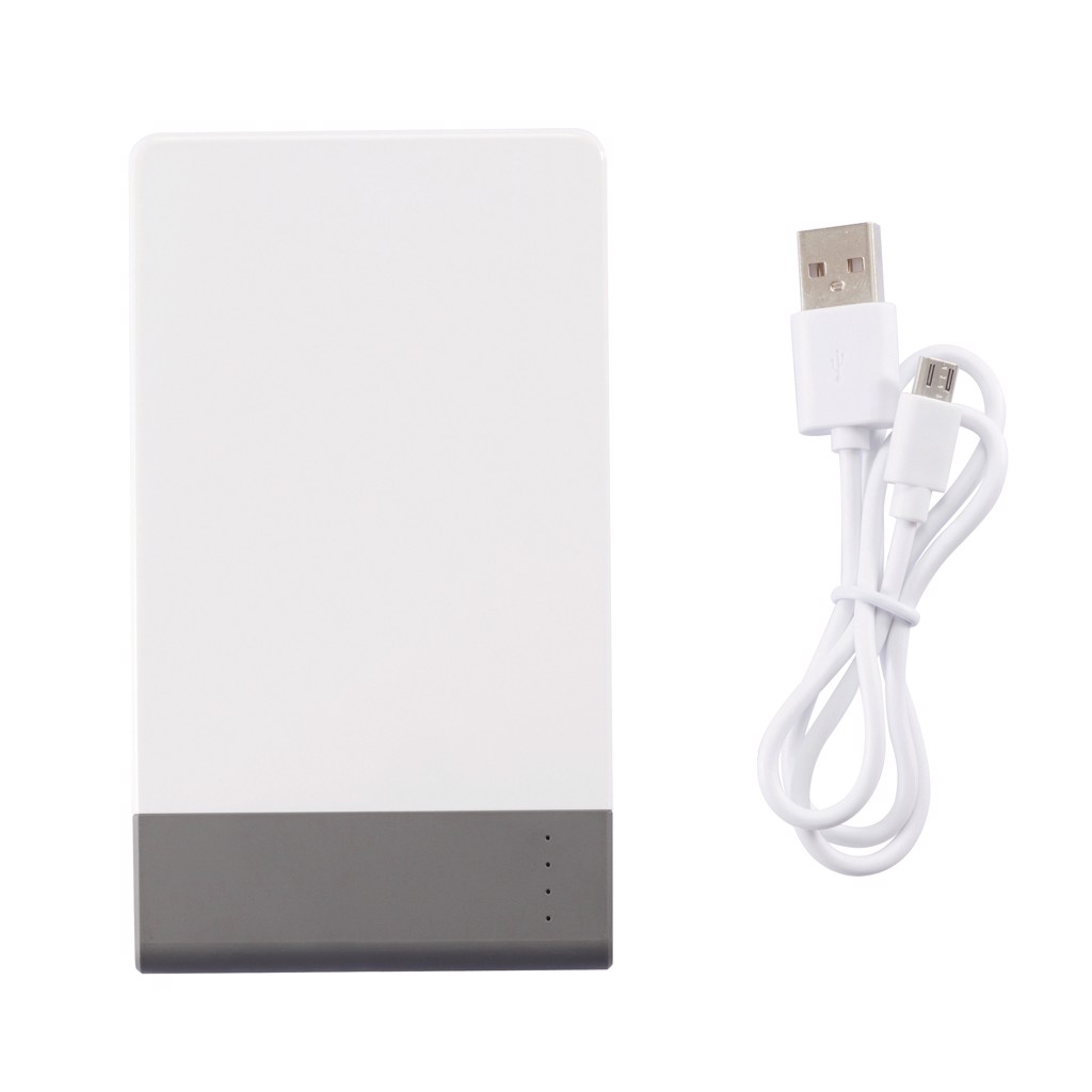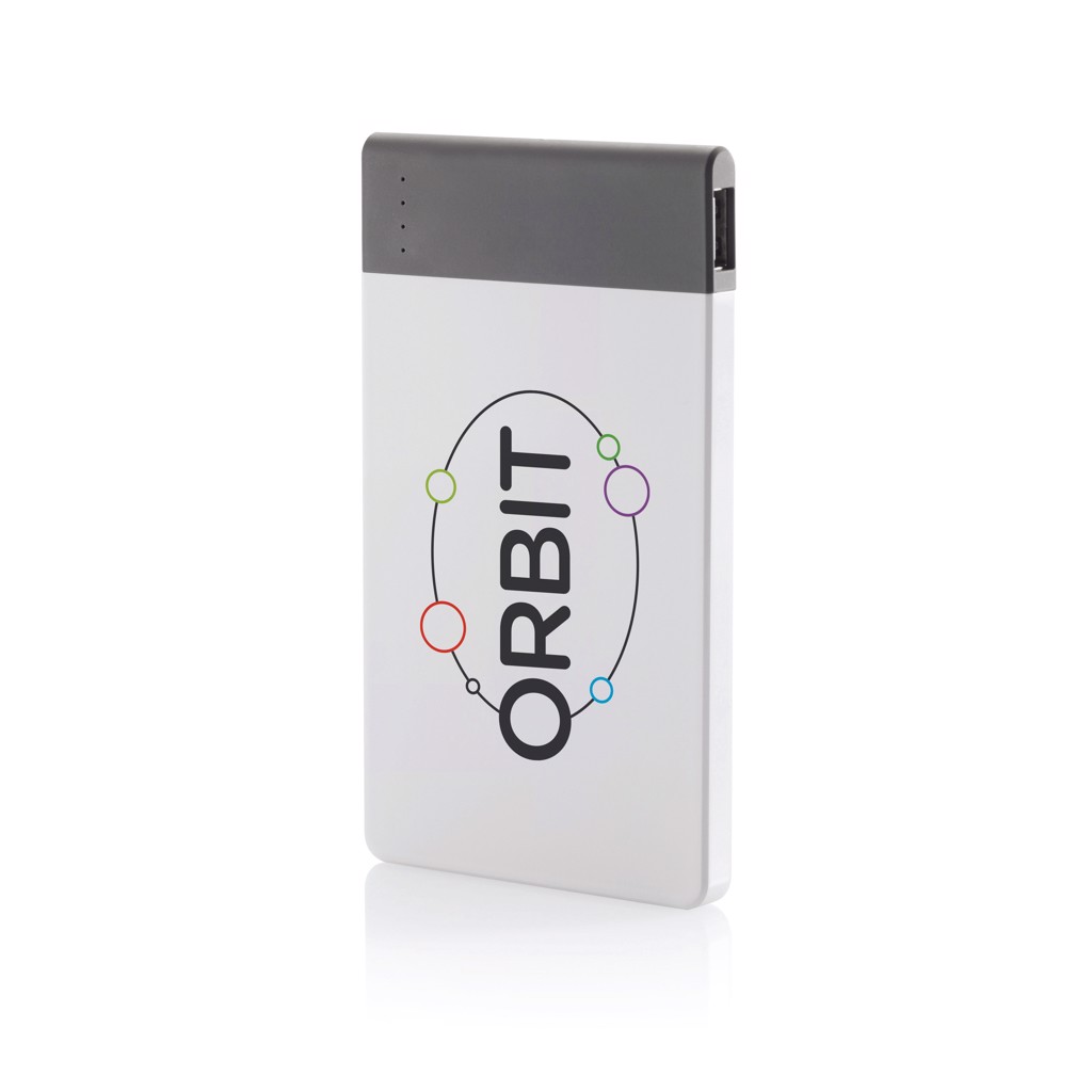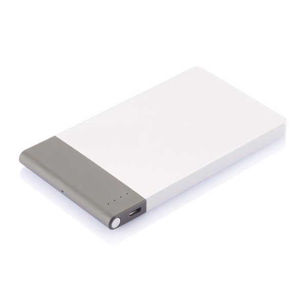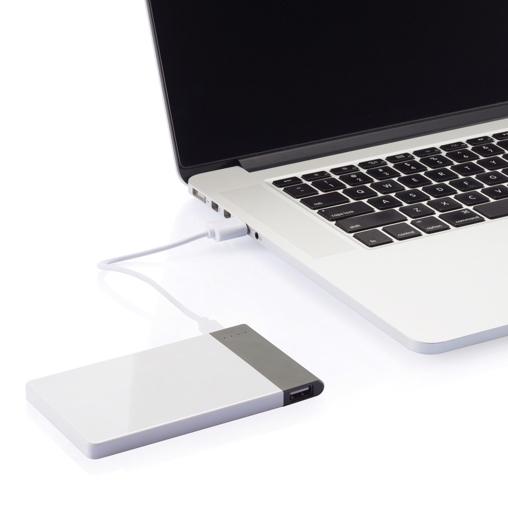 Flache 4.600 mAh Powerbank mit hochwertigem Lithium Polymer Akku. Inkl. Ein/Aus-Schalter zum Unterbrechen des Stromflusses und inkl. Ladestandsanzeige. Output 5V/2.1A, Input 5V/1A. Konfektoniert in transparenter Geschenkbox.