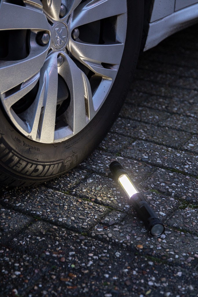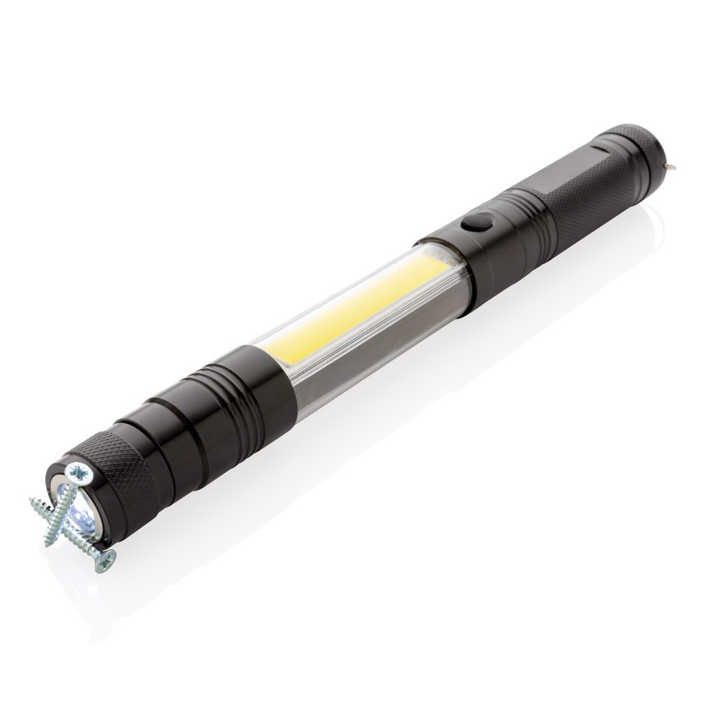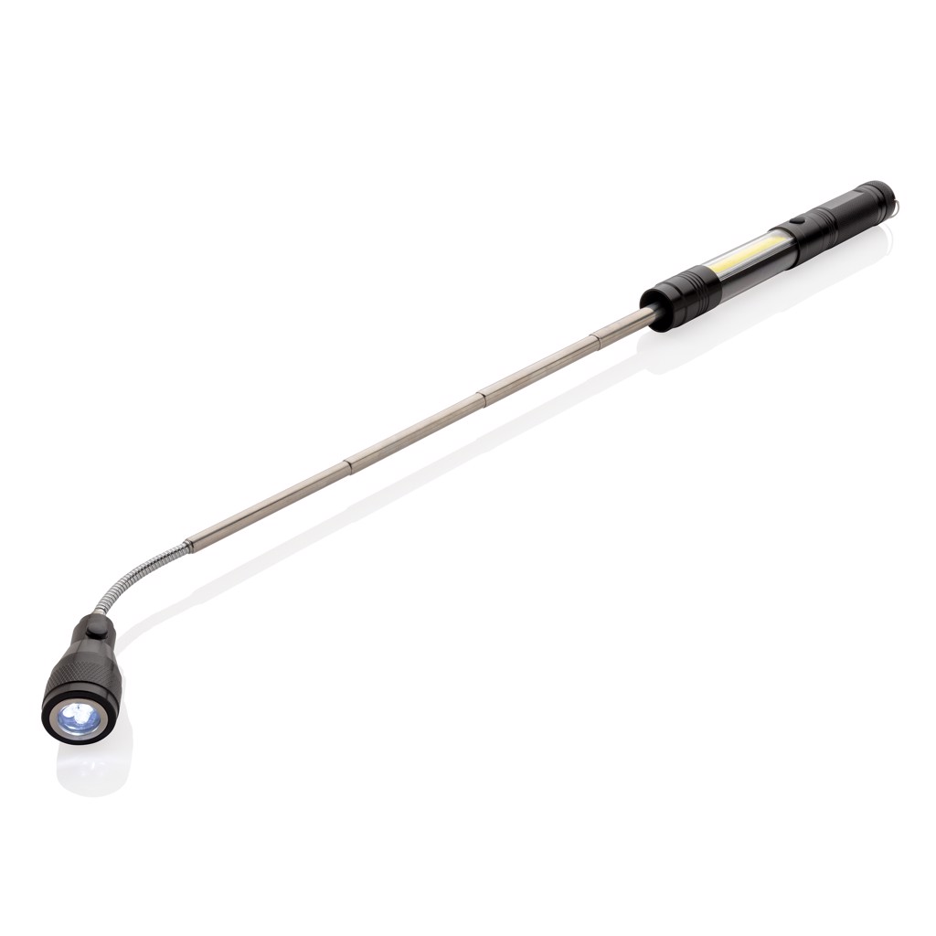 Die perfekte Arbeitsleuchte für alle Fälle. Mit dem Magnet auf der einen Seite findet sie Halt an allen magnetischen Oberflächen und mit der ausziehbaren Aluminium Lampe (26-64cm) an deren Ende sich ein weiterer Magnet befindet, beleuchten Sie nicht nur schwer einsehbare Stellen, Sie fischen auch Schrauben o.Ä. aus den entlegensten Ecken. Die Taschenlampe hat 3 LED 10 Lumen und die COB Leuchte 80 Lumen. Ebenso ist der Kopf der Taschenlampe, wenn sie ausgezogen ist, flexibel und kann so in alle Richtungen gedreht werden. Inklusive Batterien