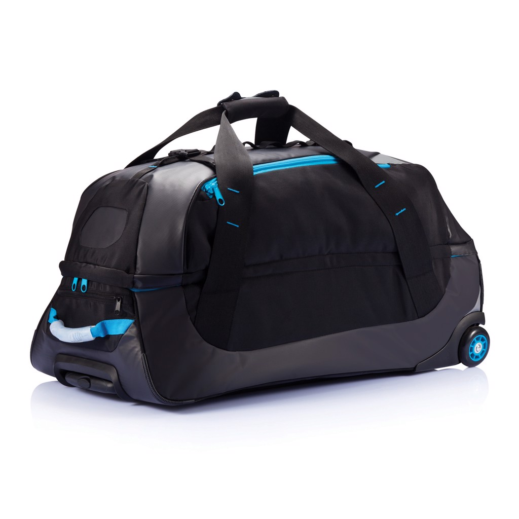 Die ultimative „off road“ Reisetasche. Großes Hauptfach und viele Innentaschen mit Reißverschluss, sowie ein abnehmbares Netz mit Reißverschluss. Aluminium Trolleygestänge mit farblich abgestimmtem Griff, inklusive Namenskartenhalter.