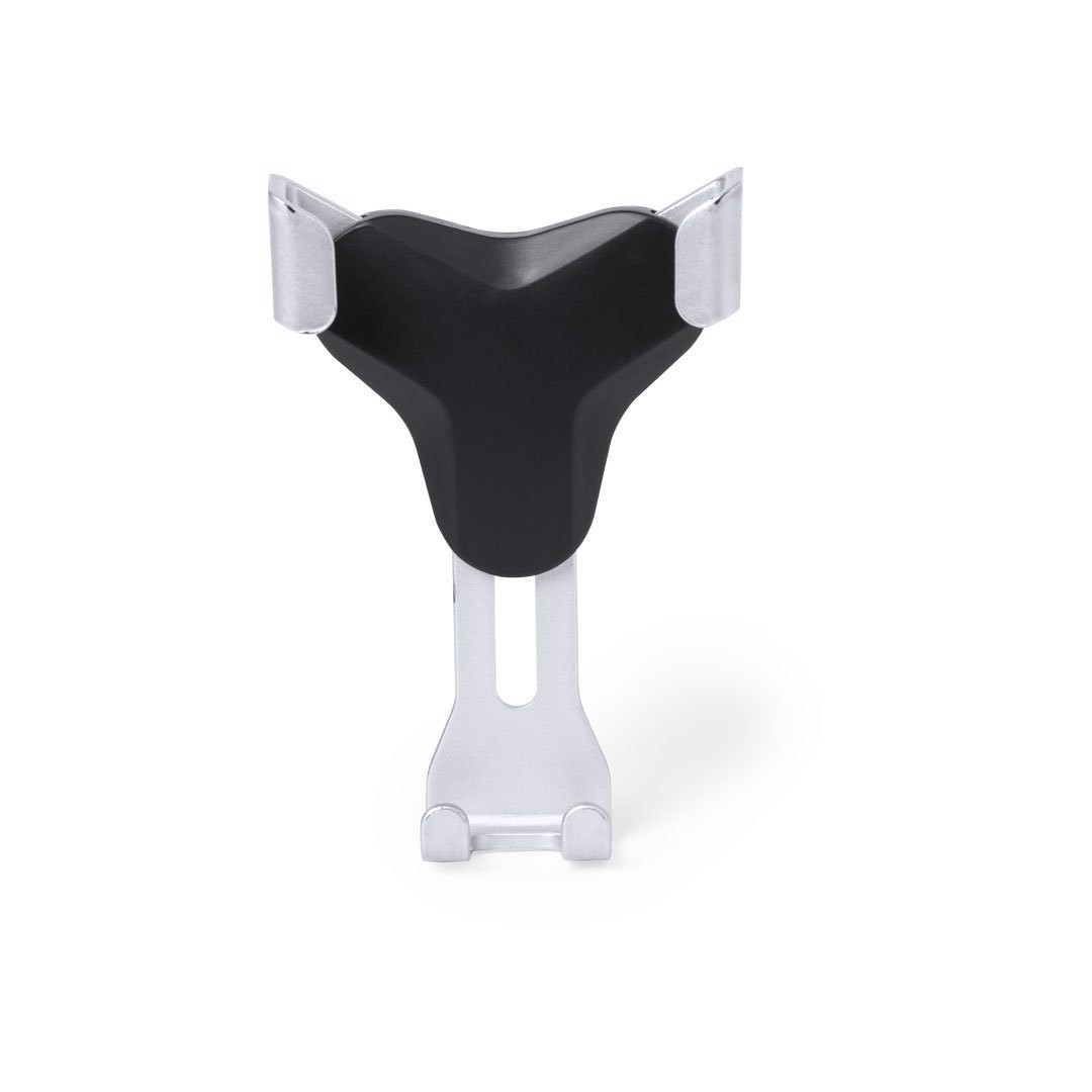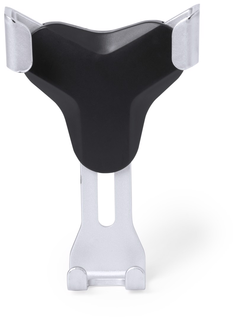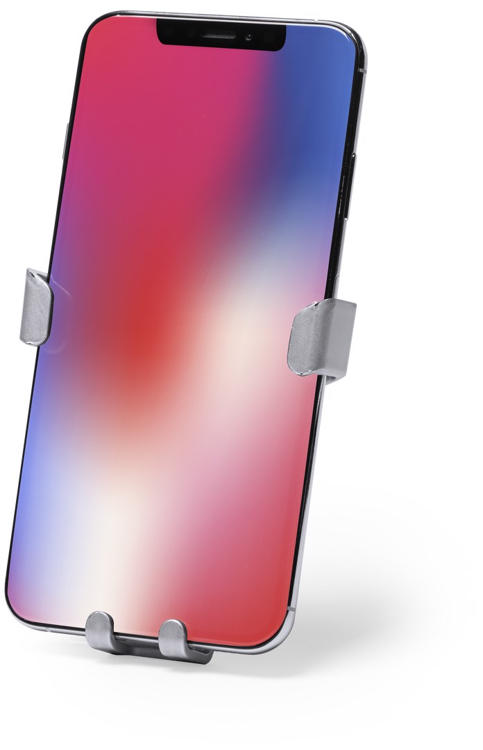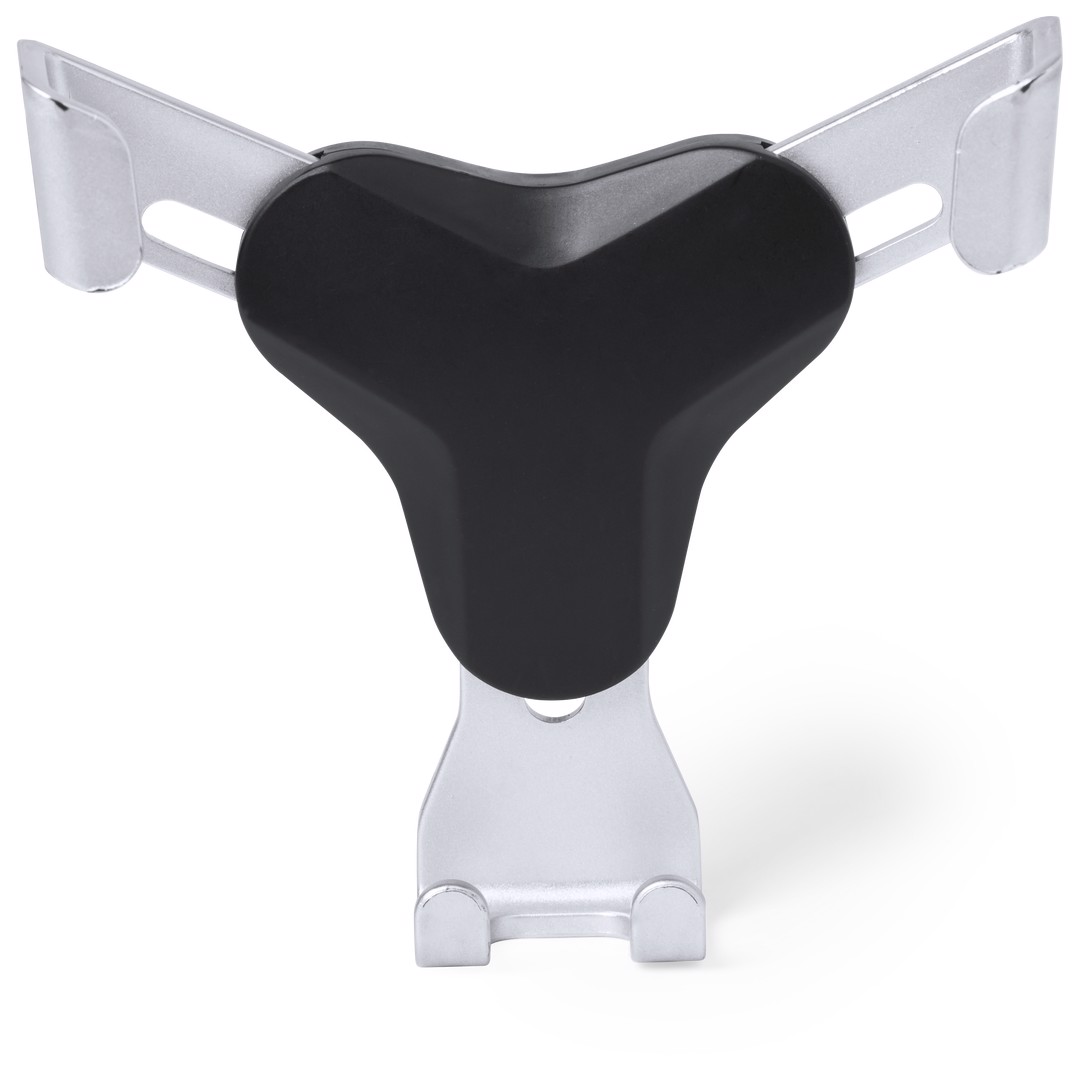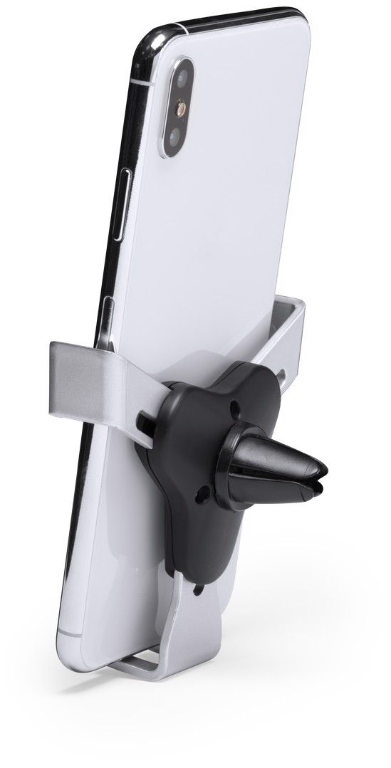Smartphone holder with minimalist design and especially designed for XXL size smartphones. With universal fixing system, activated by the weight of the phone itself, adjusting the side grips once the device is placed into the holder. For car ventilation grille and with front side especially designed for pad printing. Adjustable