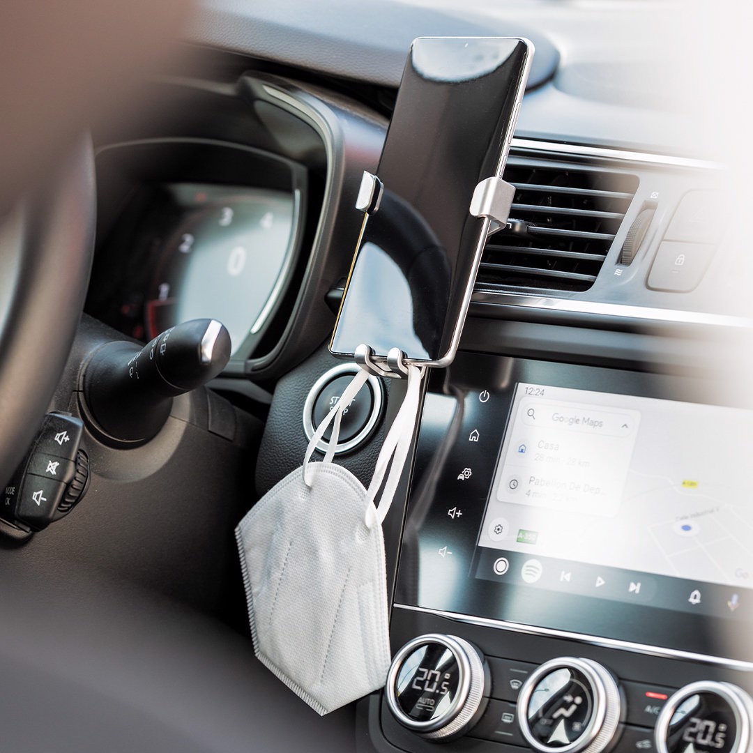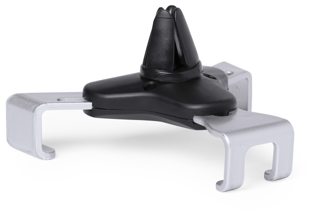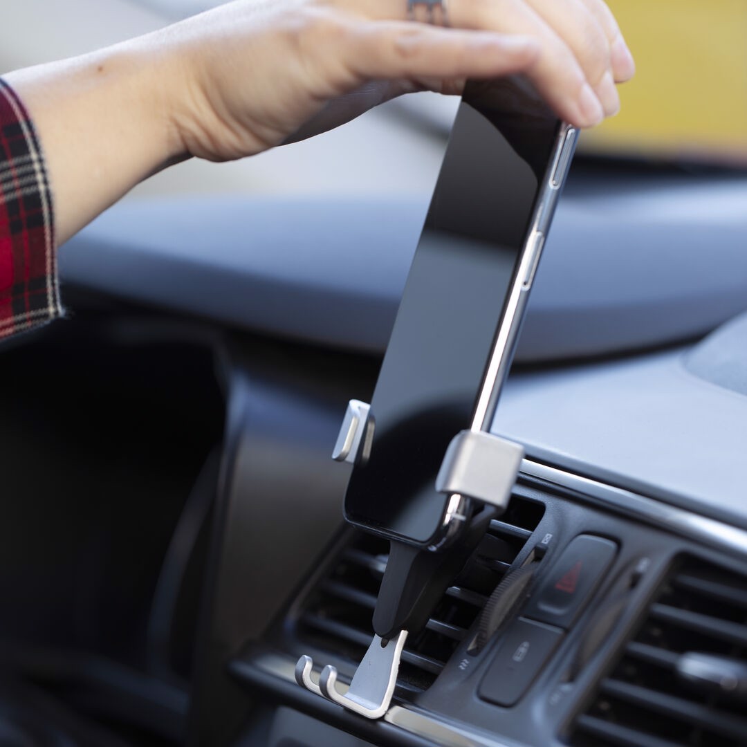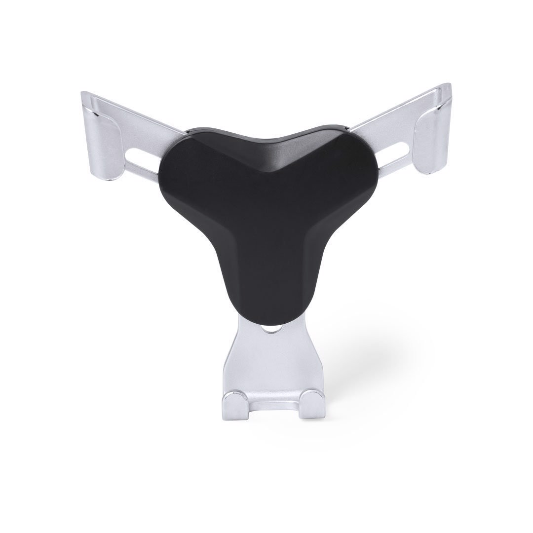 Smartphone holder with minimalist design and especially designed for XXL size smartphones. With universal fixing system, activated by the weight of the phone itself, adjusting the side grips once the device is placed into the holder. For car ventilation grille and with front side especially designed for pad printing. Adjustable