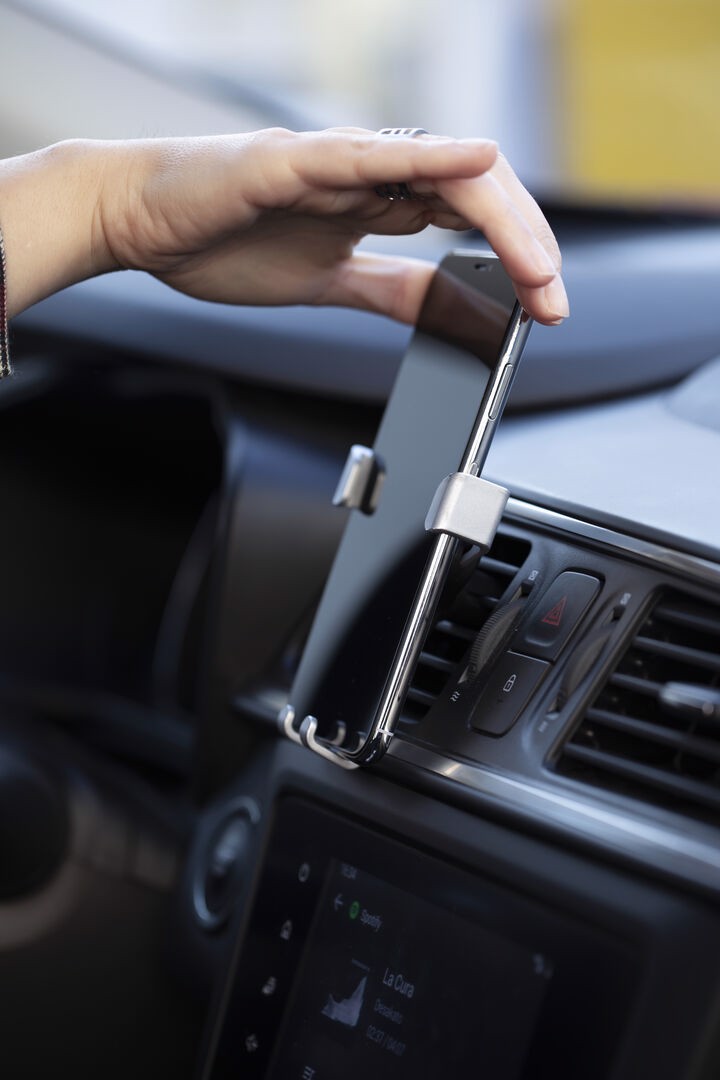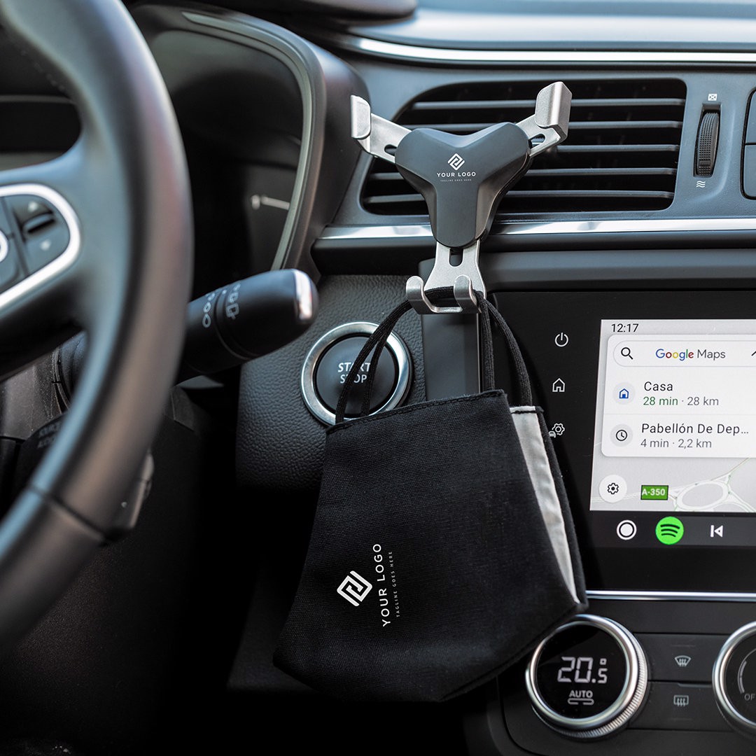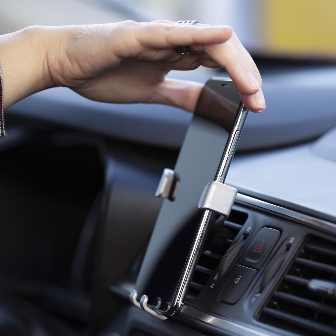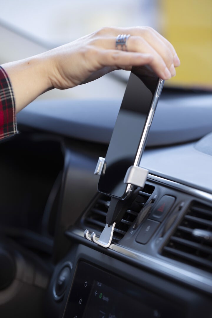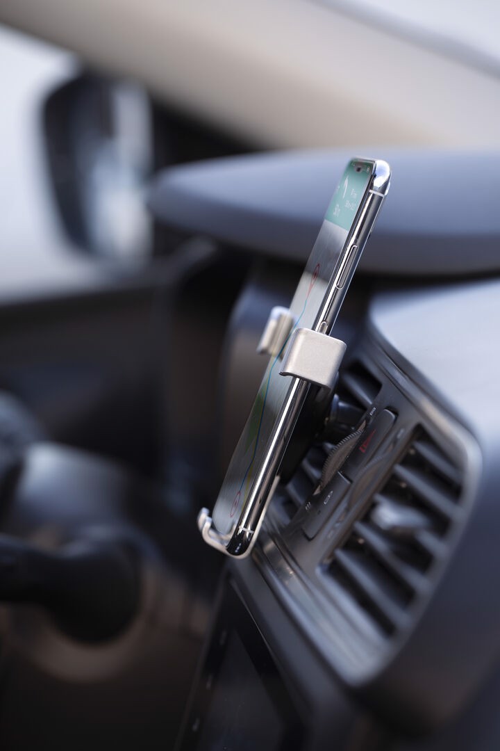 Smartphone holder with minimalist design and especially designed for XXL size smartphones. With universal fixing system, activated by the weight of the phone itself, adjusting the side grips once the device is placed into the holder. For car ventilation grille and with front side especially designed for pad printing. Adjustable