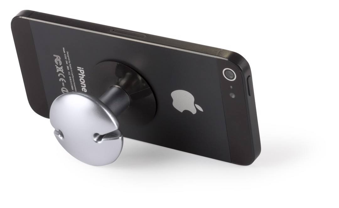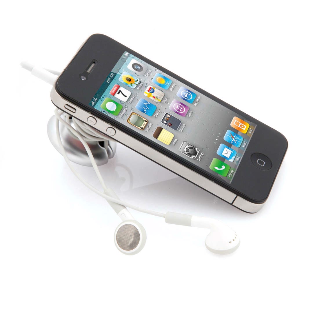 Smartphone holder with earphone holder function (earphones not included) and suction cup fixing system.