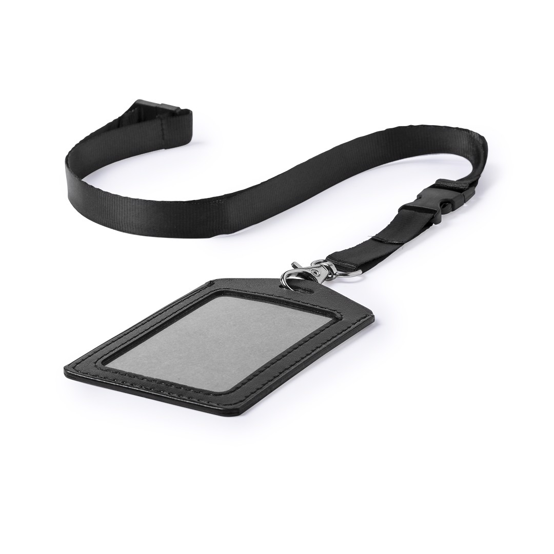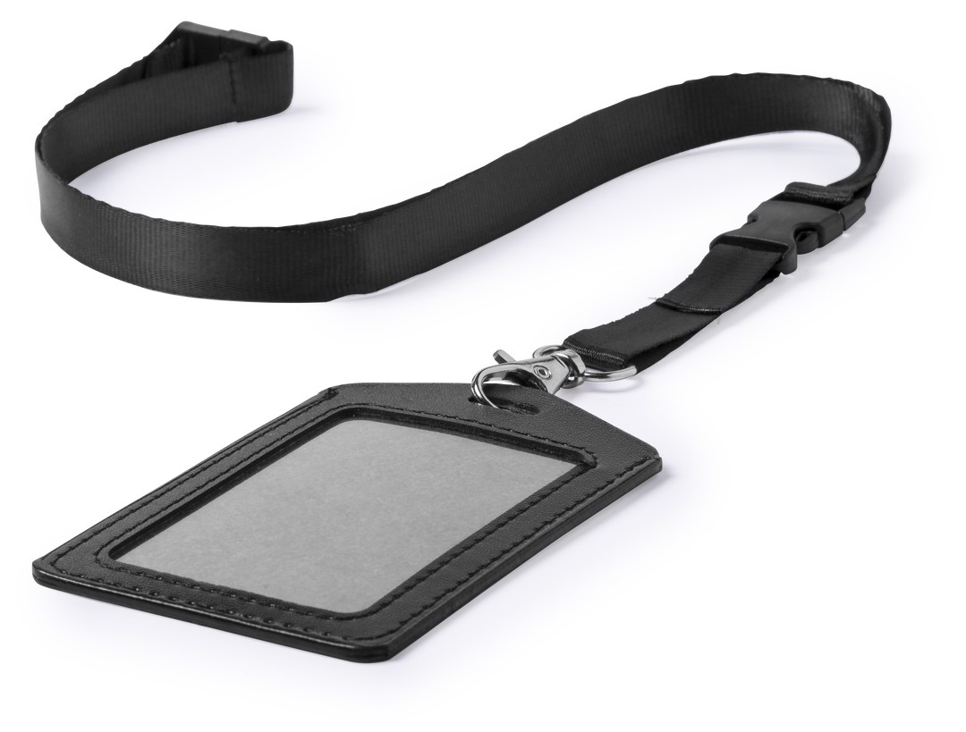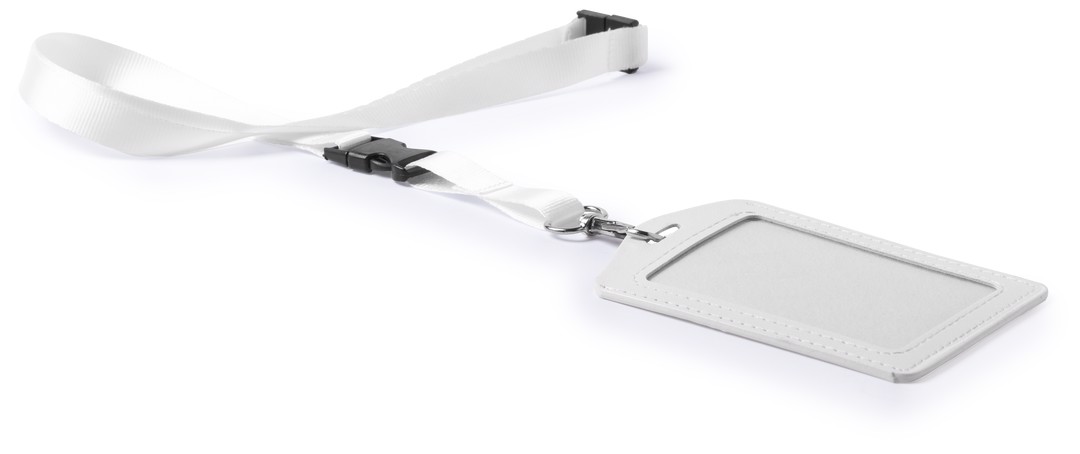 Lanyard with identifier in matching color. Lanyard in resistant polyester, with neck security accessory and buckle closure for an easy handling of the identifier, with carabiner adjust. PU leather identifier, with PVC window and slot for an easy card insertion. Set available in white and black colors. Safety Catch