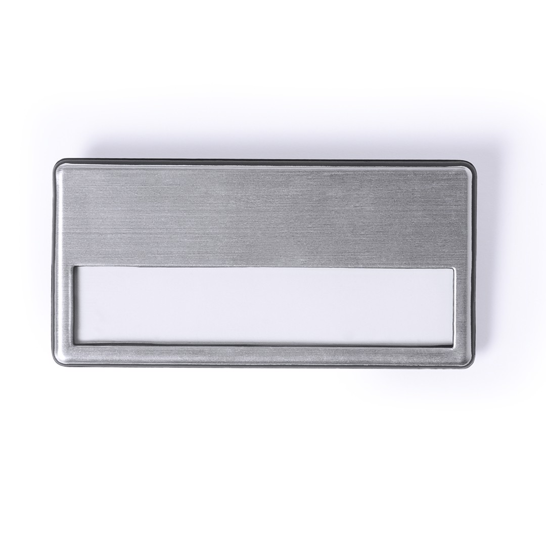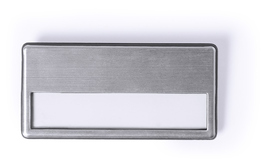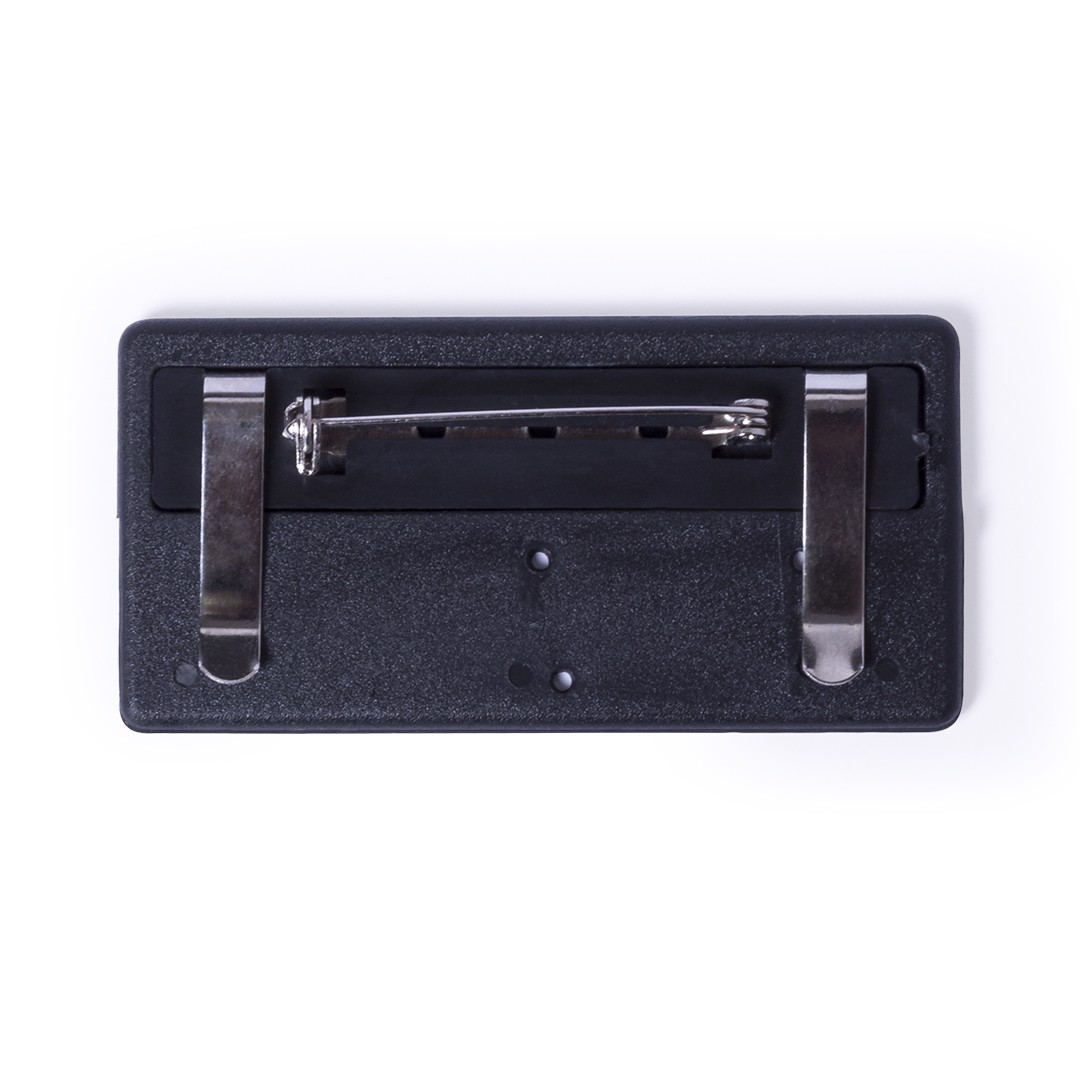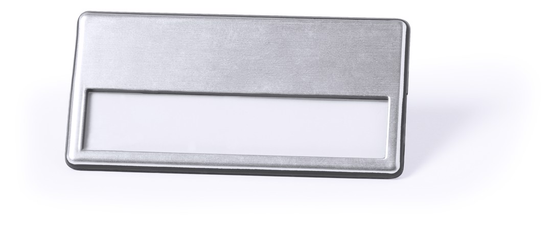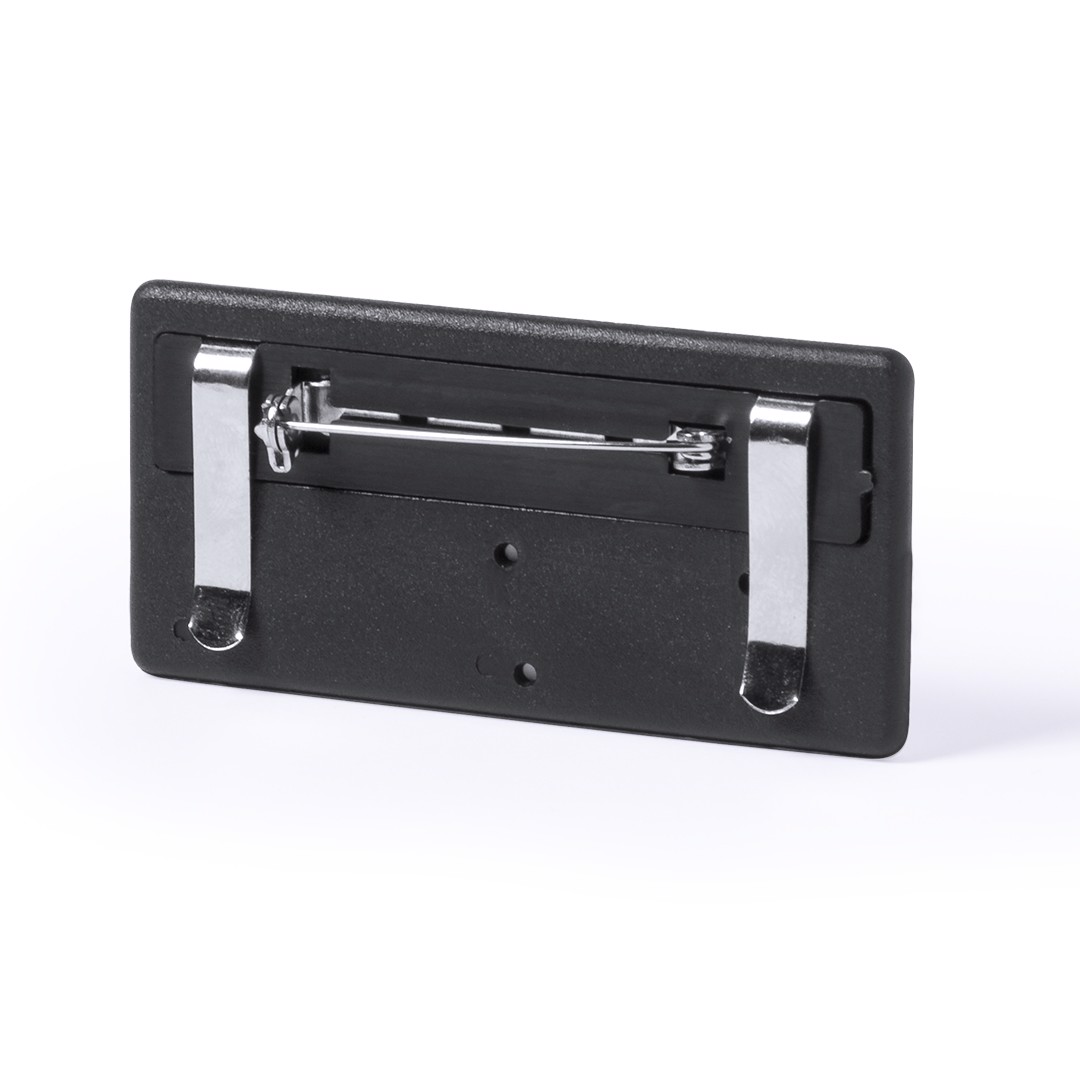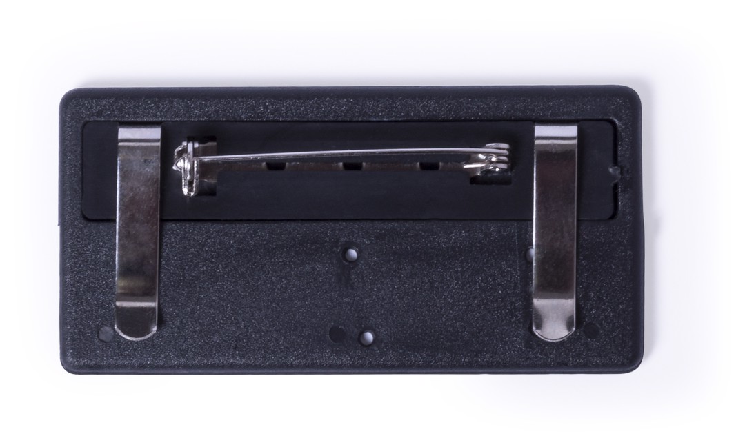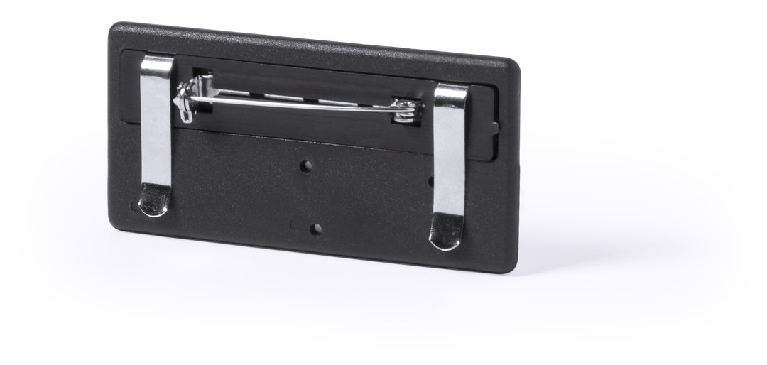 Name tag in shiny finishing. Rear side with double fixing system - metal clips and safety pin- for secure adjustment.