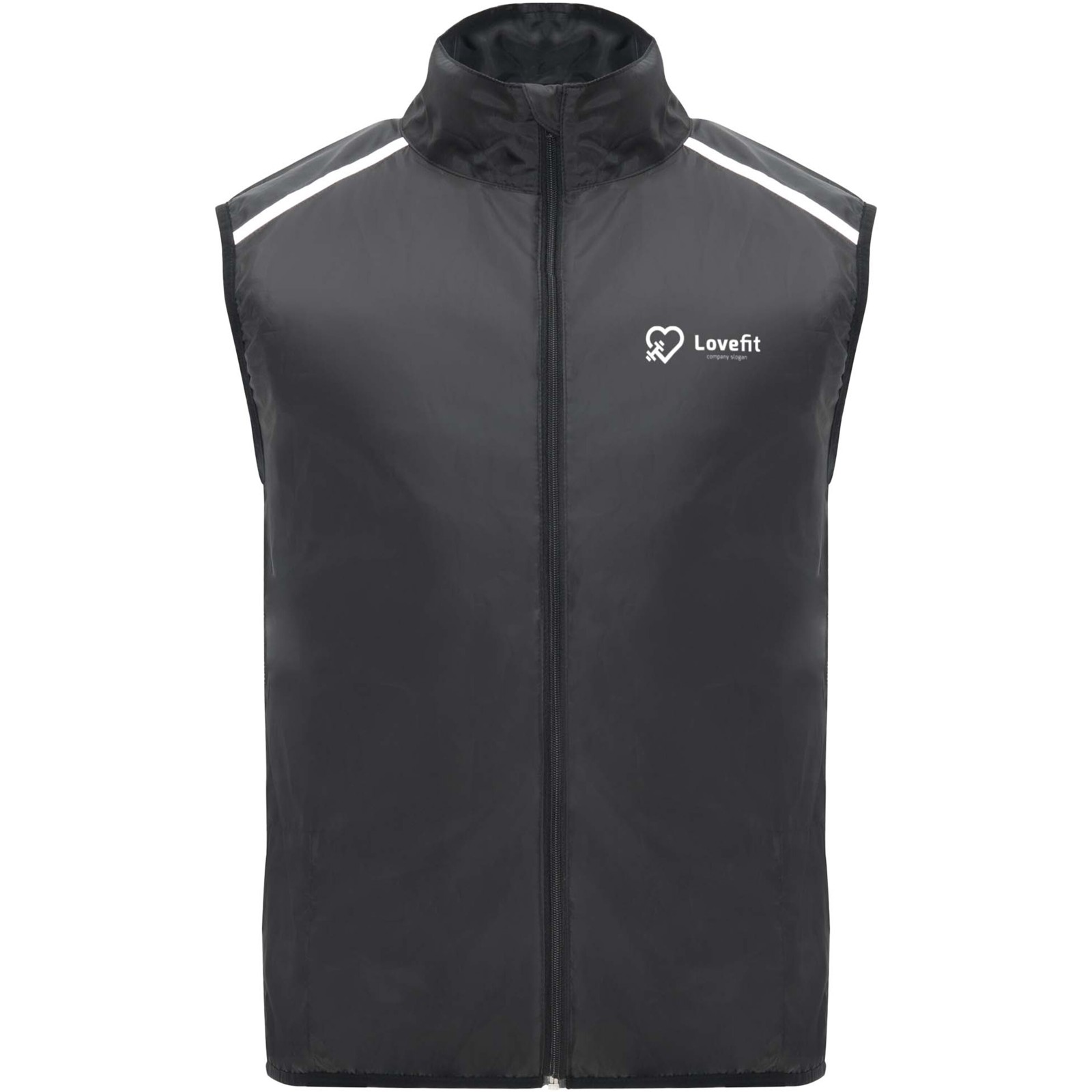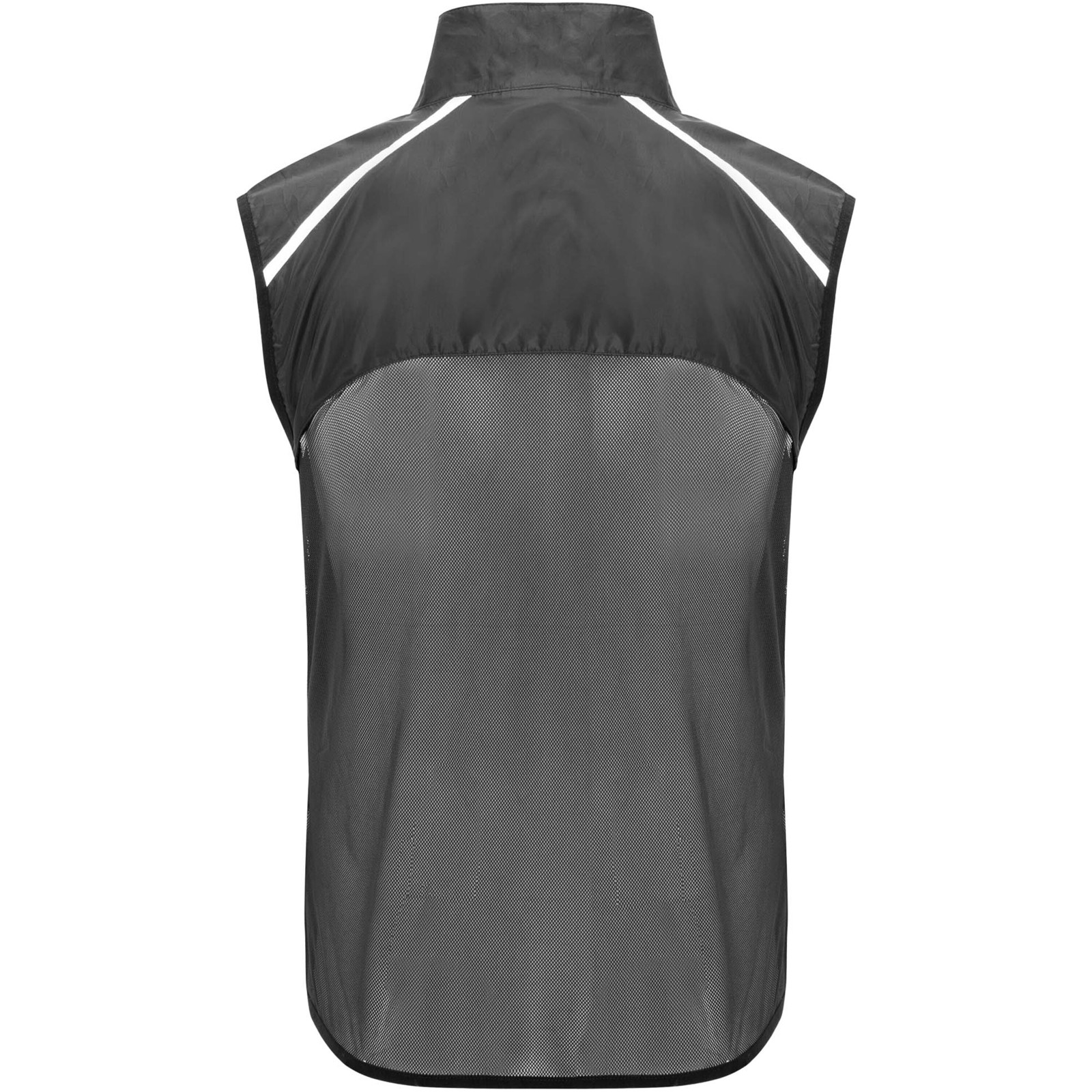 Wind-proof and breathable. Front zip with matching chin protector. Elastic binding at armhole and bottom. Bottom part of the back in microperforated fabric. High-visibility details on the top, front and back. Pocket with elastic strap to stow the vest and wear it on the wrist. Removable label.