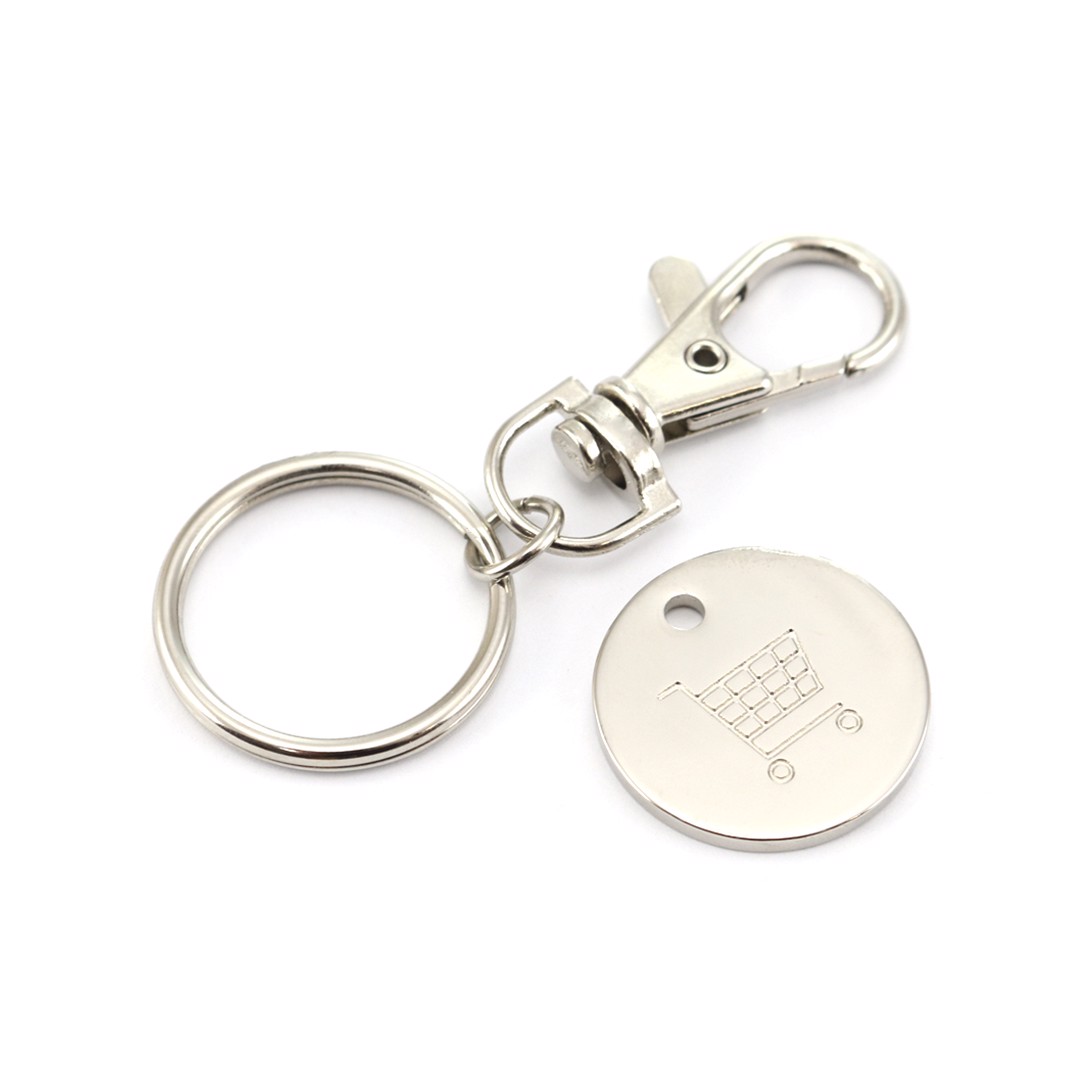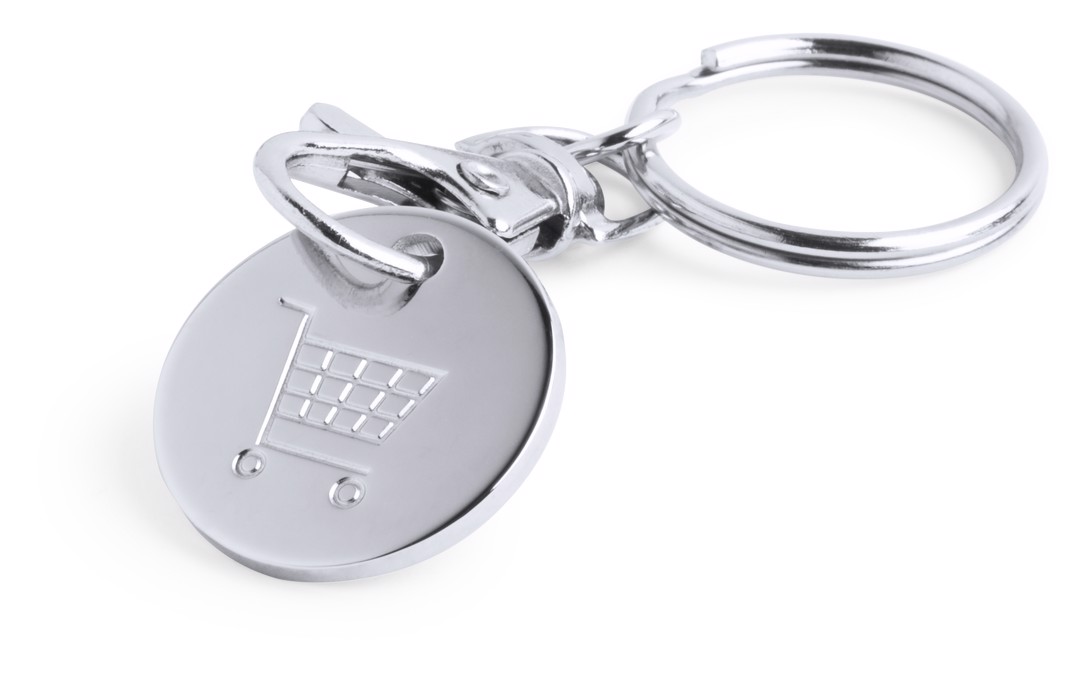 Metallic keychain coin in fun design in varied colors with removable coin and closure carabiner.