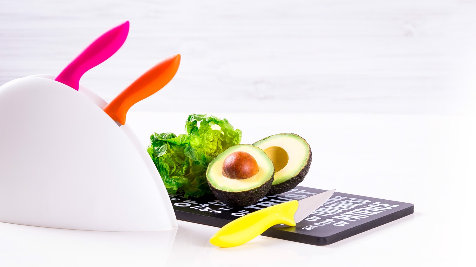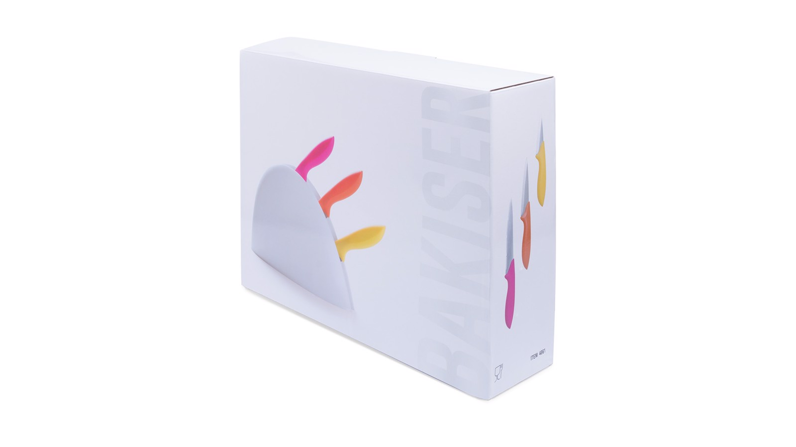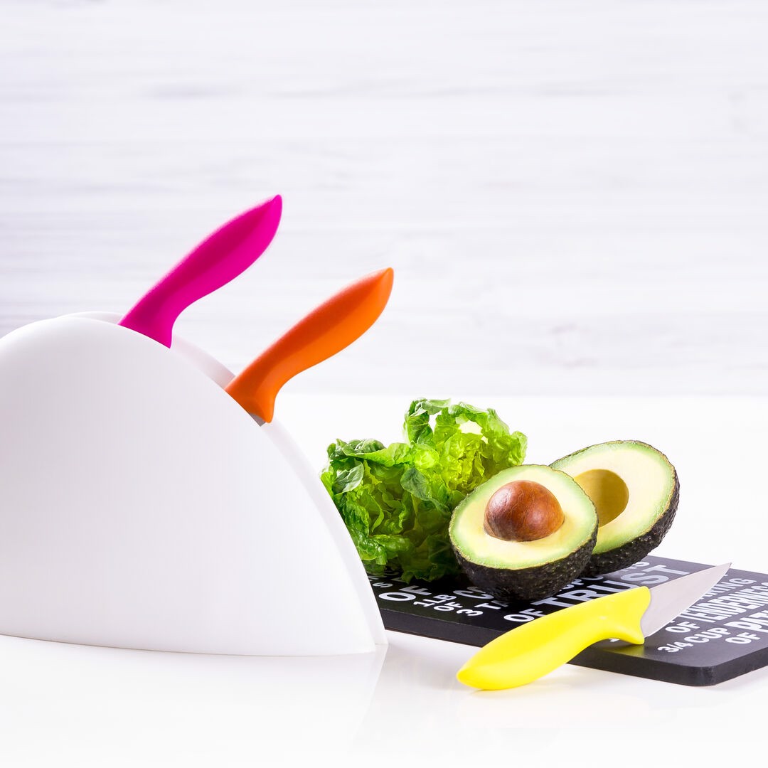 Set of knives of different sizes with different blades in stainless steel and soft ergonomic handle in cheerful tones. With resistant support and presented in an individual box. 4 Pieces