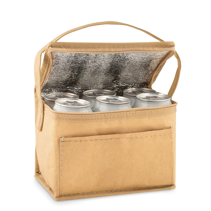 Kühltasche aus Kraftpapier mit Reißverschluss. Platz für 6 Getränkedosen. Mit Tragegriff und Fronttasche. Isoliermaterial: PE-Schaumstoffschicht. Füllmenge 3L.