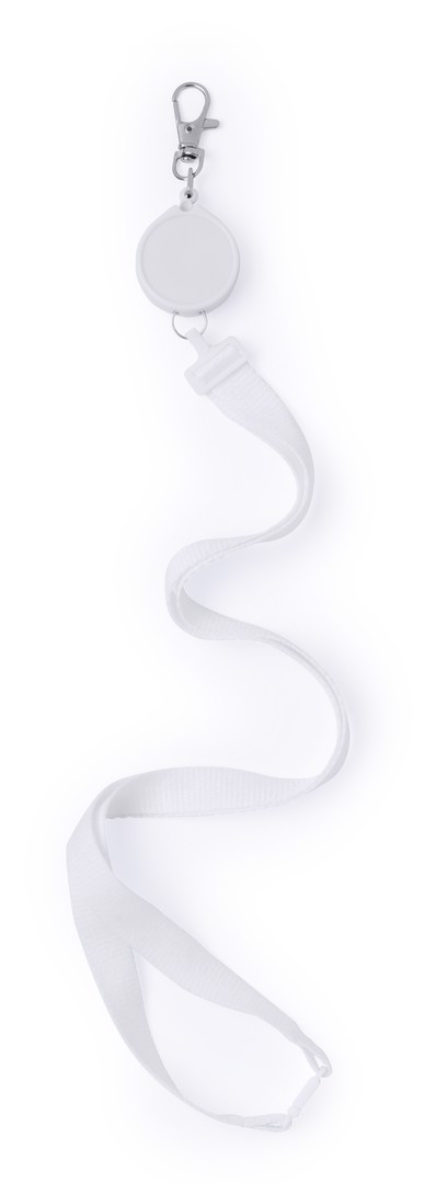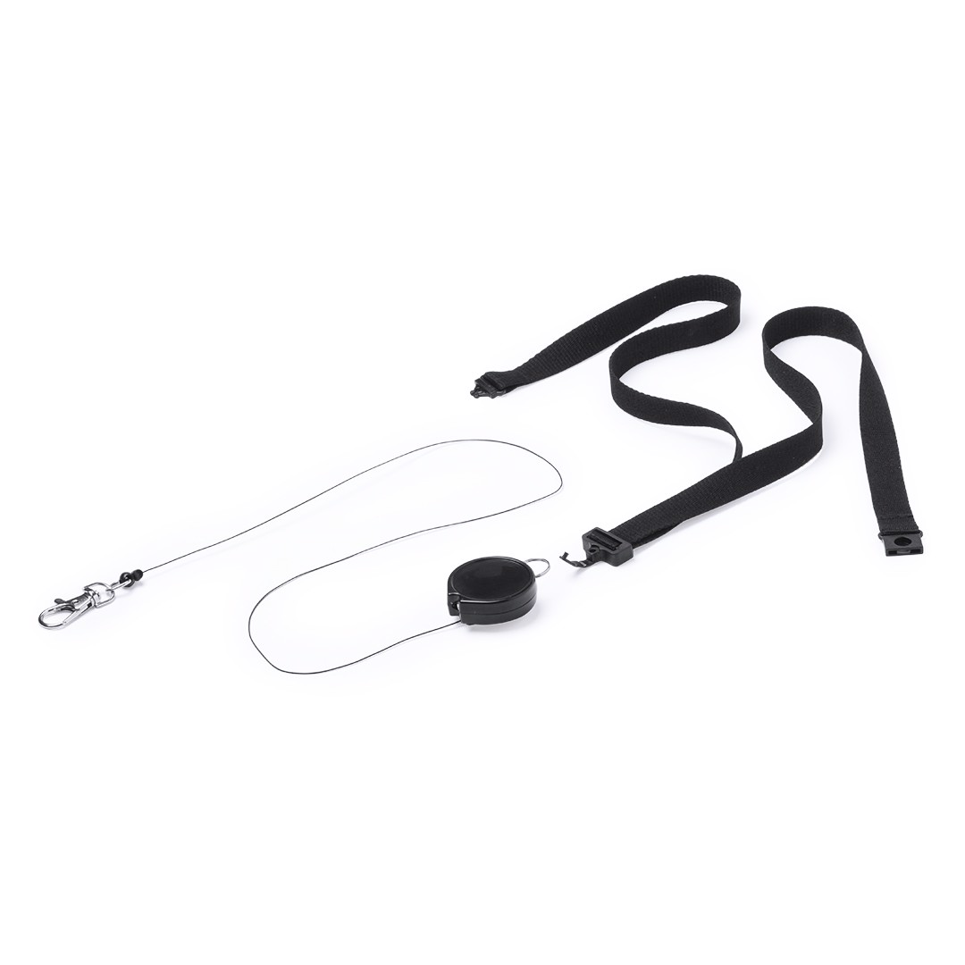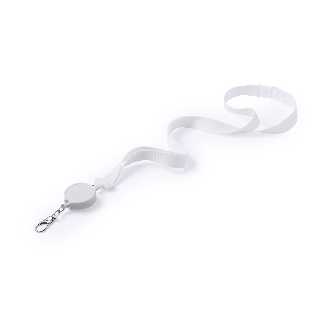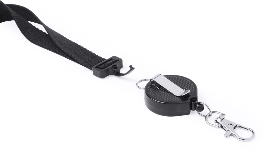 Handy polyester lanyard with retractable accessory. Security neck closure and extensible accessory with clip in one side, leaving the other side blank for logo. Metal carabiner. Set available in white and black colors. Extendable. Safety Catch