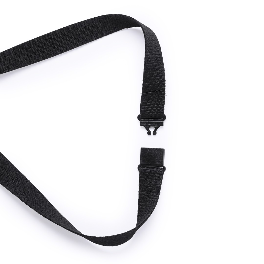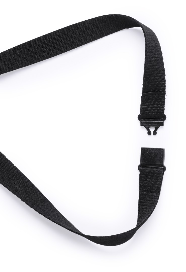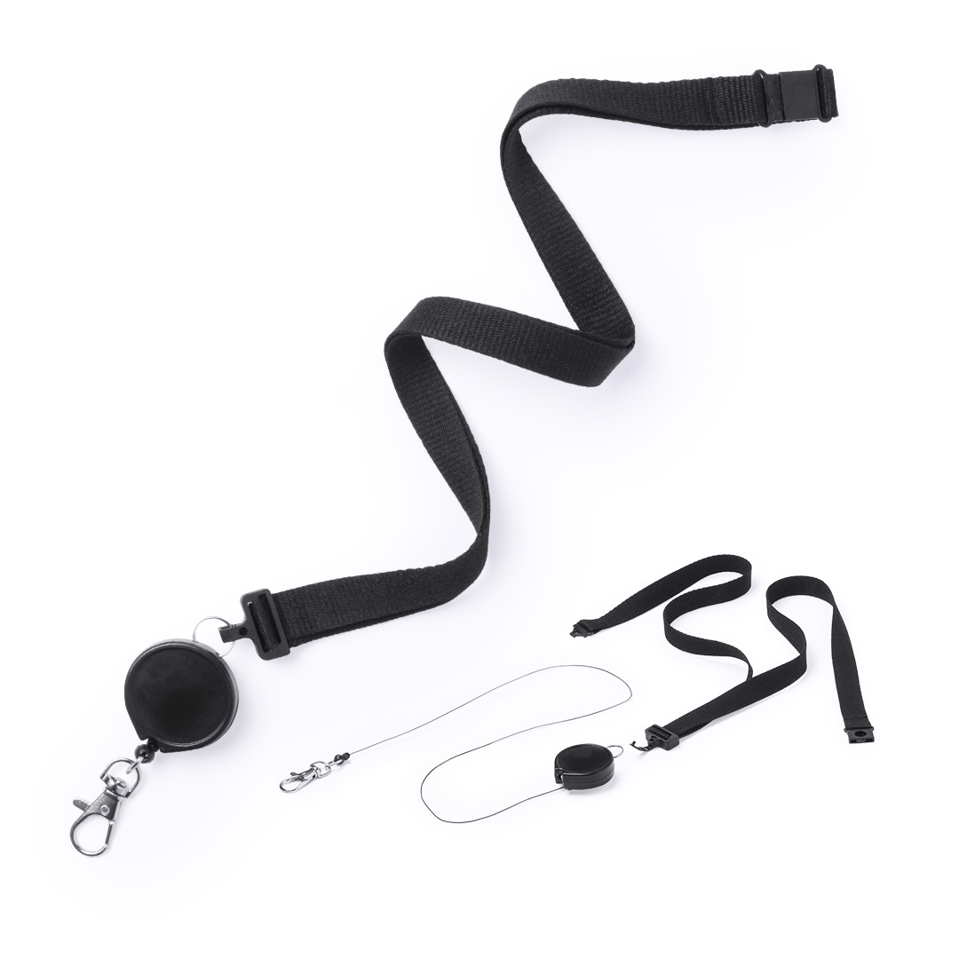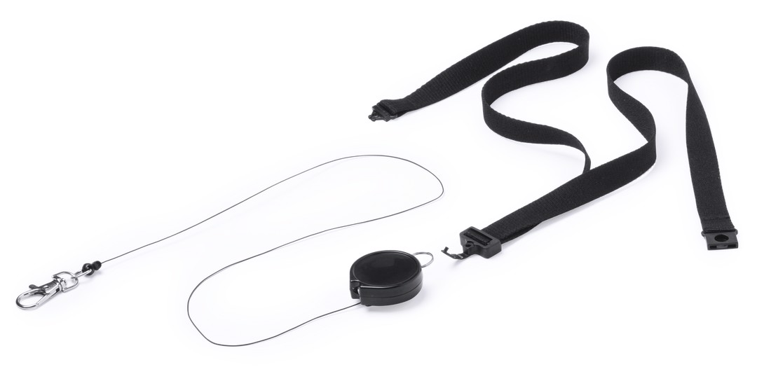 Handy polyester lanyard with retractable accessory. Security neck closure and extensible accessory with clip in one side, leaving the other side blank for logo. Metal carabiner. Set available in white and black colors. Extendable. Safety Catch