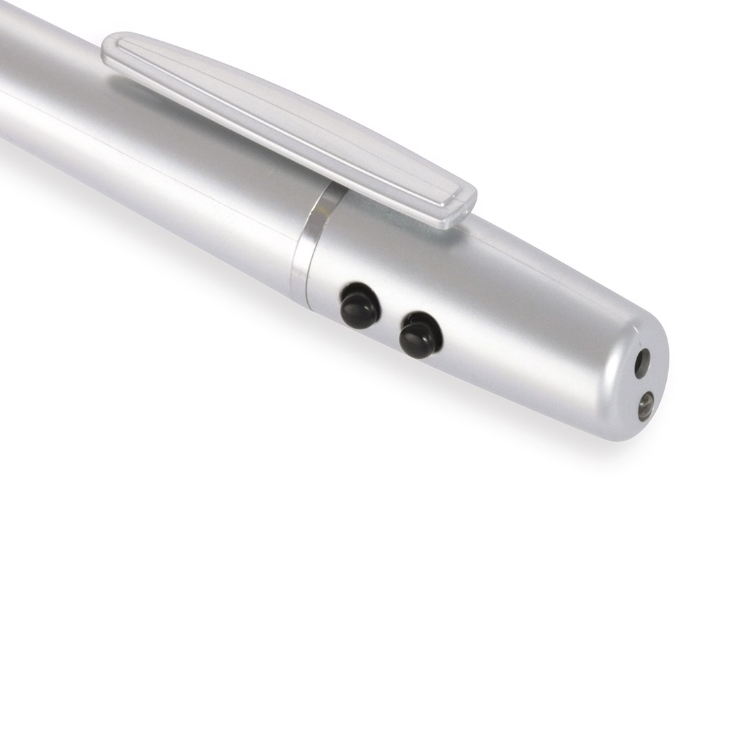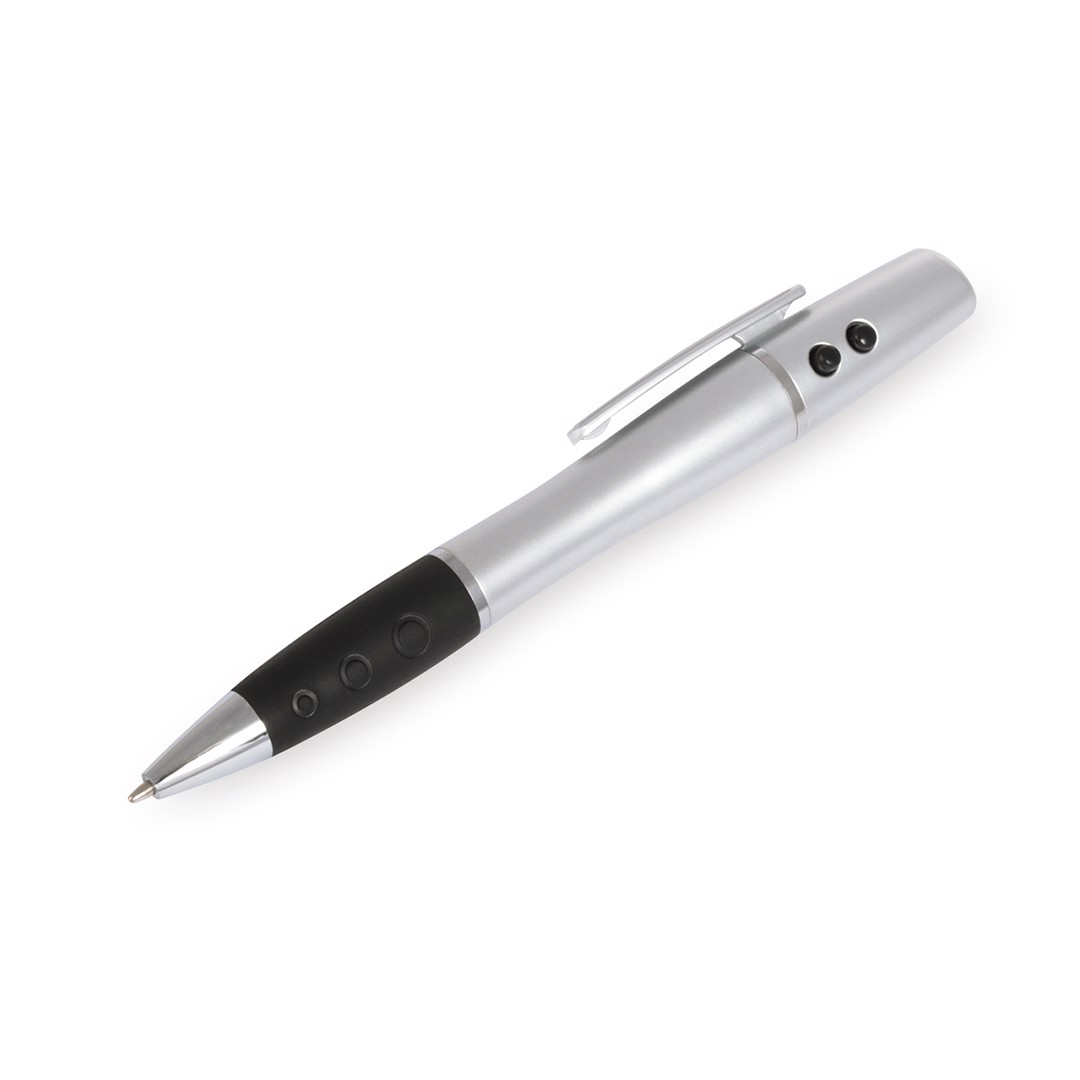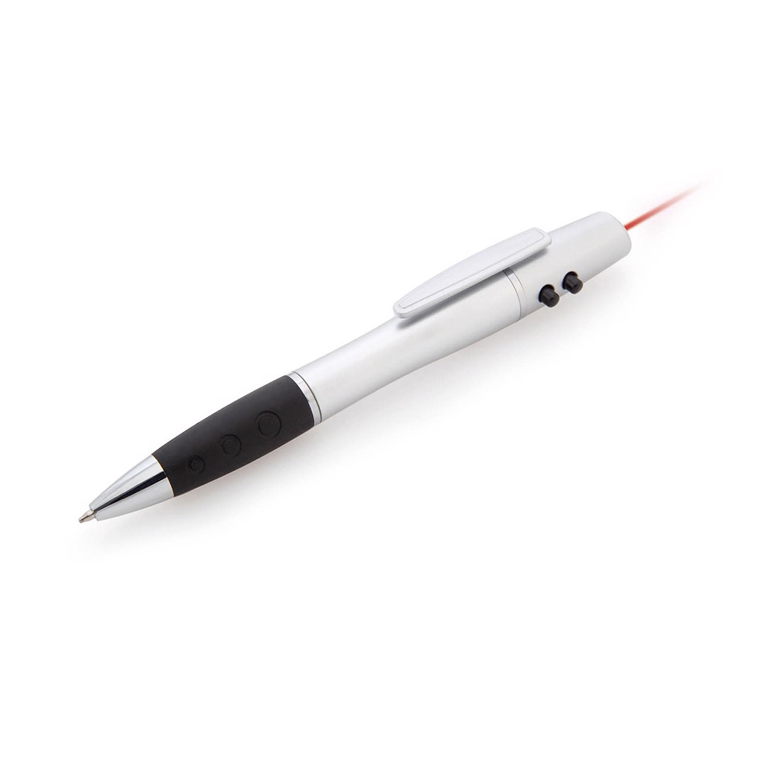 Class 1 laser ball pen of twist mechanism, with sober bicolor design and soft grip. It incorporates lateral activation buttons, practical fixing clip and curved body especially designed for pad printing. Battery power supply: button included, and presented in an individual box. 1 Led. Button Batteries Included