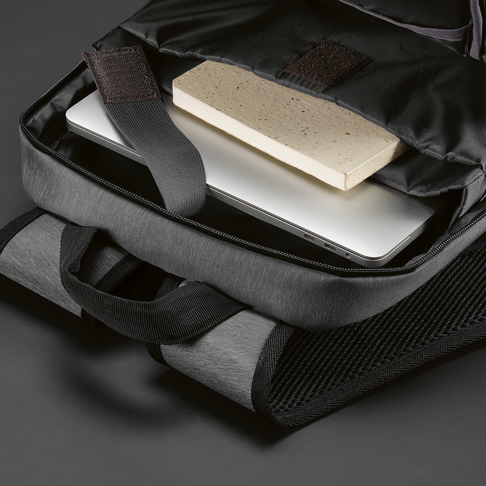 Madrid Backpack made from recycled nylon. Features a 22L spacious capacity, a reinforced top handle and waterproof zippers. The padded laptop compartment will hold a 17” laptop and the elastic side pocket is ideal for carrying a bottle. On the opposite side a zippered side pocket for storage. The inner lining reflects the colour of the bag’s exterior and adjustable shoulder straps, and trolley straps have been added for extra comfort and convenience. Complete with an individual recycled cotton bag.
