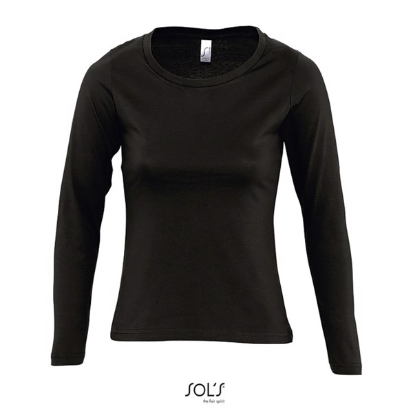 SOL'S MAJESTIC Langarm-Damen-Shirt. Rippkragen mit Elastan, leicht dekolletiert, Nackenband, gerade Bündchen, Schlauchware. Material: 150g/m², Single-Jersey, 100% halbgekämmte, ringgesponnene Baumwolle.