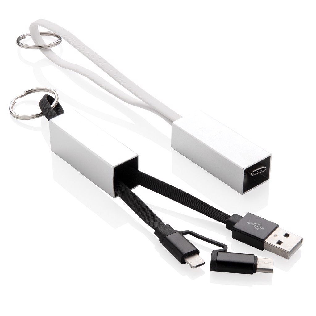 Modernes 3-in-1 Ladekabel mit Type-C USB und zweiseitigem Anschlußstecker für iOS und Android Geräte, die einen Micro-USB Anschluß benötigen. Die Kabel bestehen aus TPU, das Schutz-Case aus Aluminium. Mit Schlüsselring. Nicht nur Ladekabel, sondern auch zur Synchronisation Ihrer Daten geeignet. Länge: 15cm.
