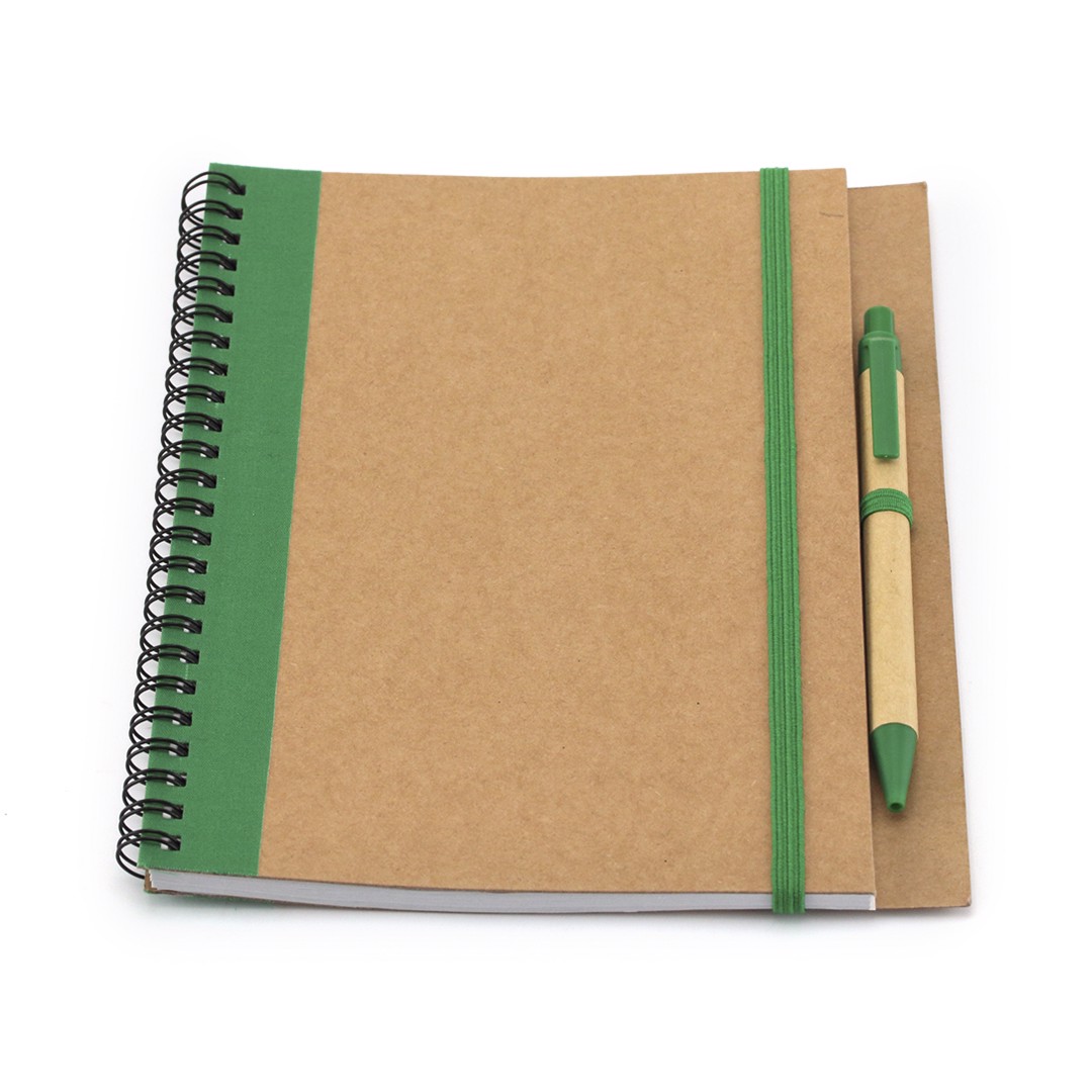 Ring notebook with soft-touch covers in resistant bicolor recycled cardboard, elastic fastening on the cover and ball pen in matching color recycled cardboard. Bold colors, 60 blank sheets with ball pen holder on back cover. Hard Cover. 60 Sheets. Recycled Cardboard Pen Included