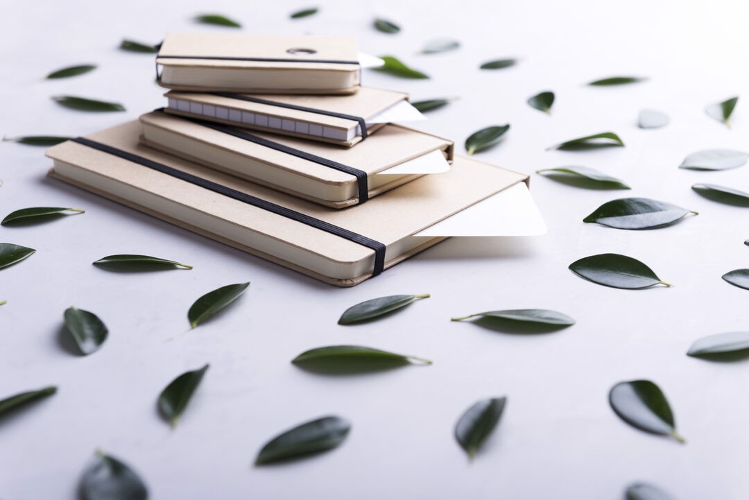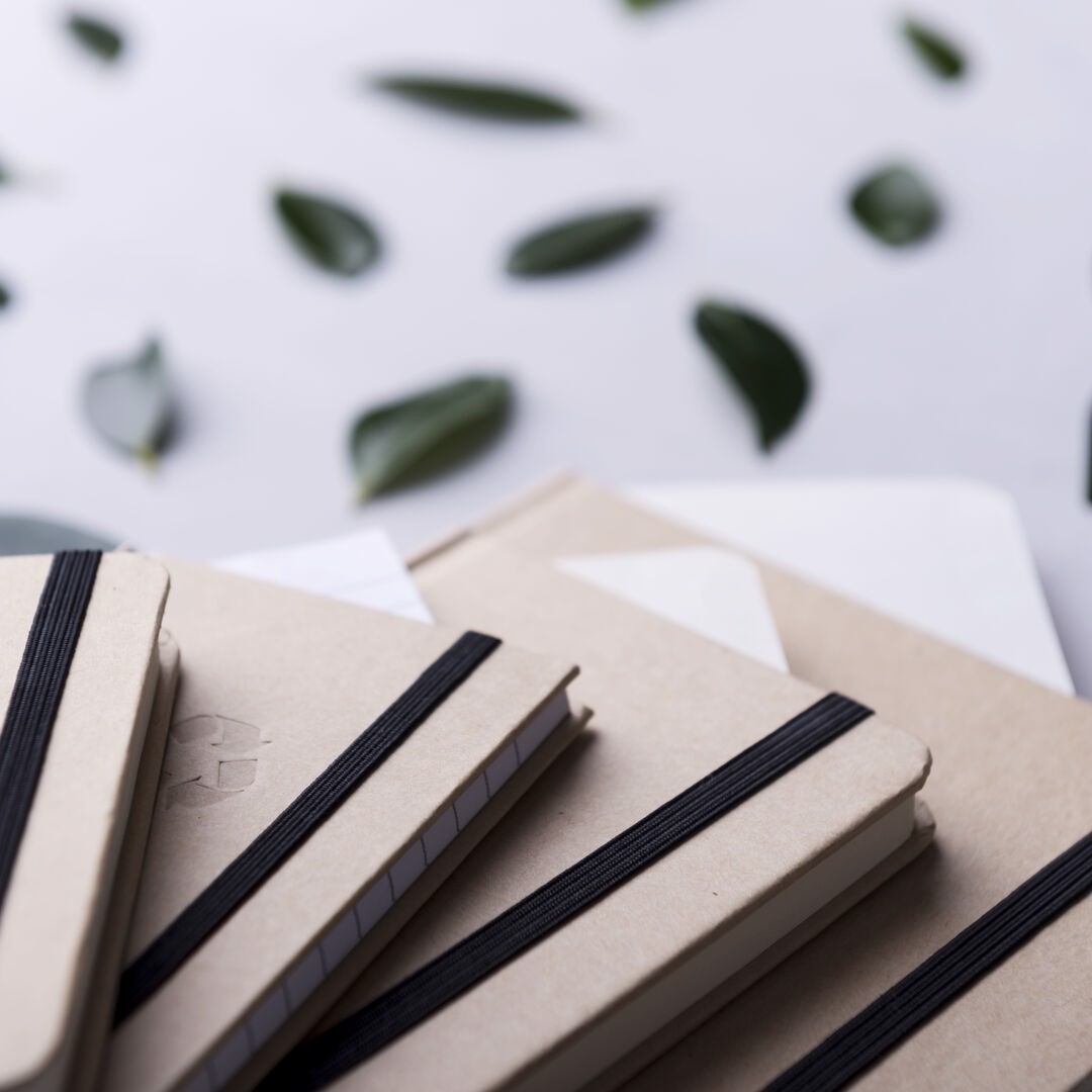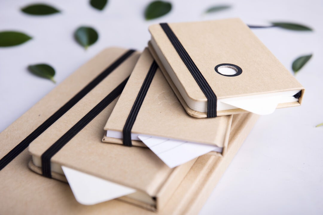Notepad with soft touch covers in resistant natural cardboard. 100 blank sheets, with elastic band and matching color fabric bookmark. Hard Cover. 100 Sheets