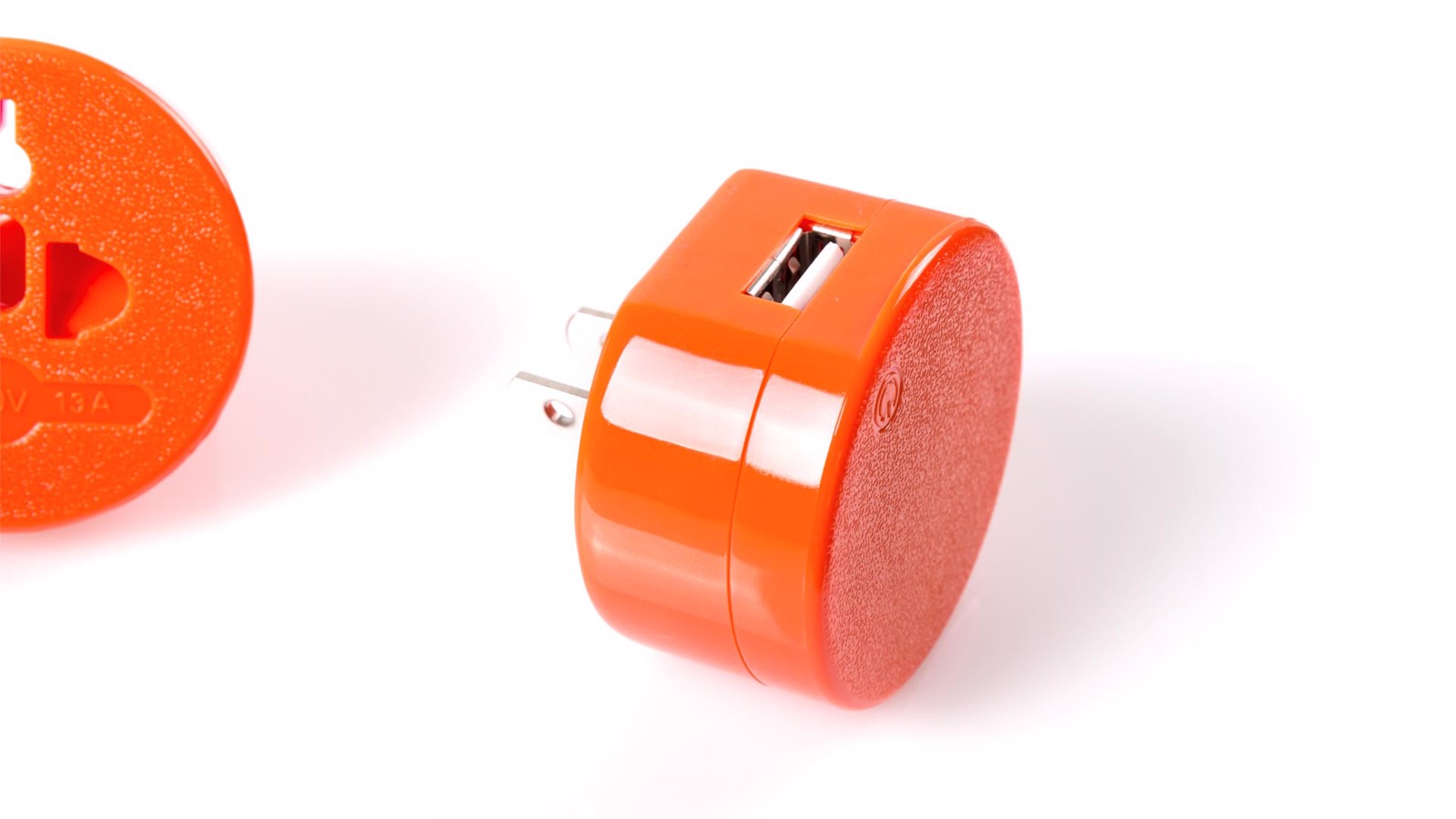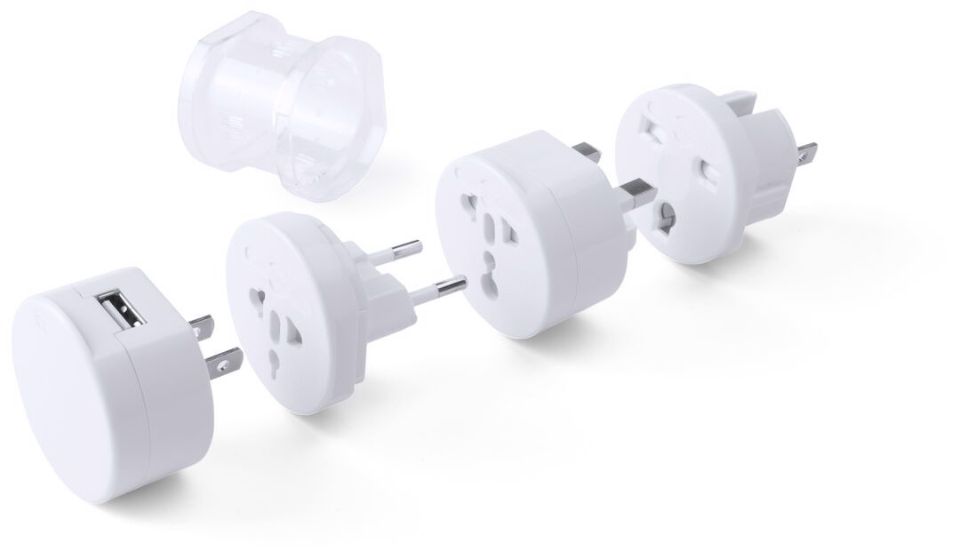 Plug adapter with USB output. With a compact and portable design, 1,000 mA charging capacity and in casual colors. Especially suitable for travelers and including multi-region adapters for the USA, Europe, Asia and the United Kingdom. Presented in an individual box. 1 USB Output. 1000 mA. USA, Europe, Asia, UK, Australia
