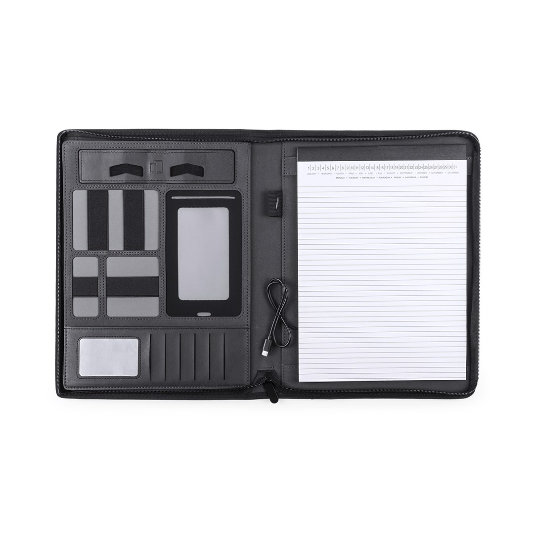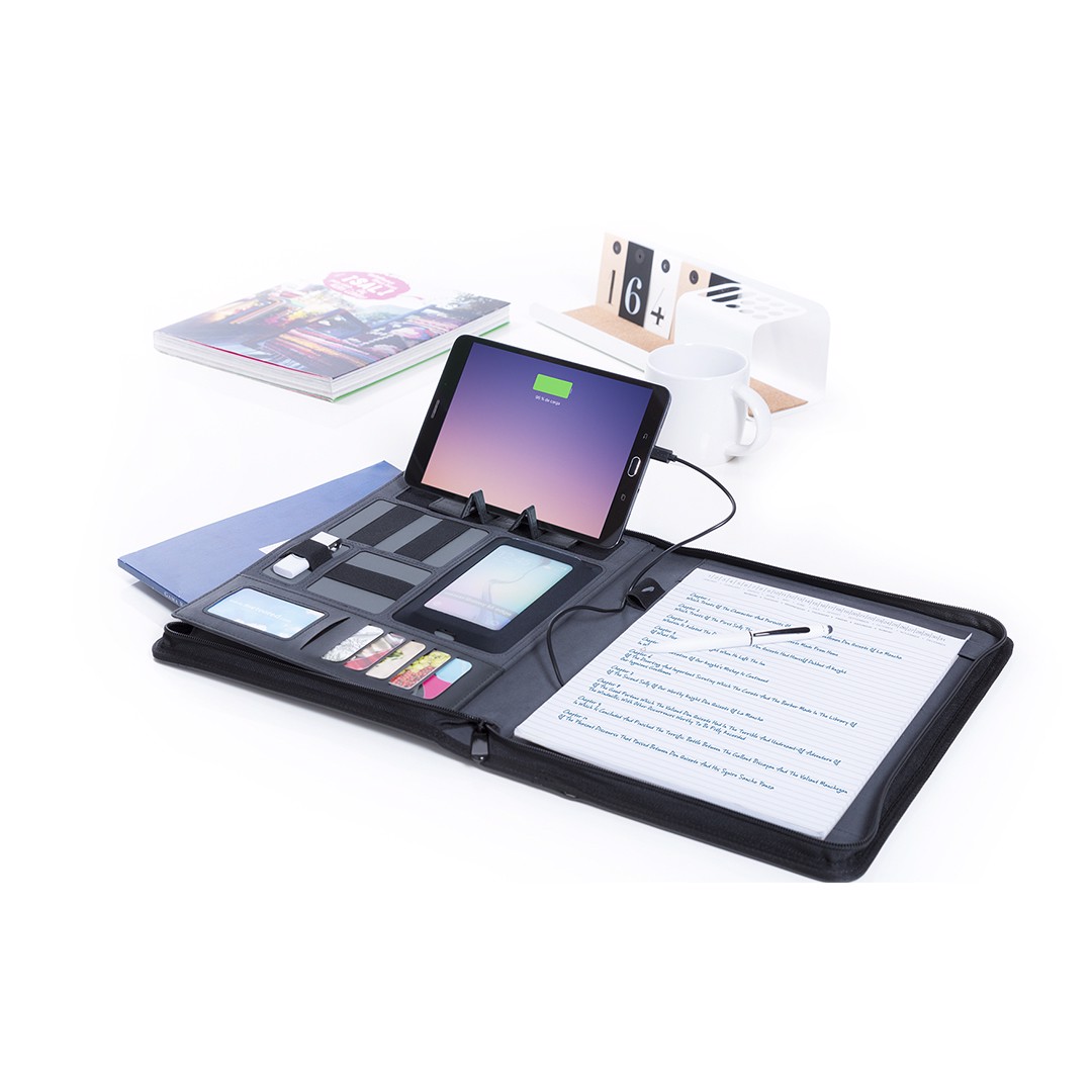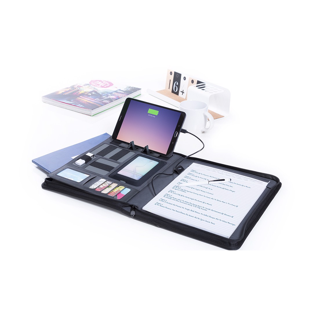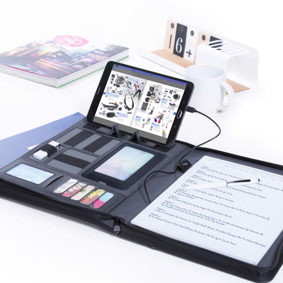 Stylish and soft black PU leather folder with a built-in, external auxiliary battery of high charge capacity -5,000 mAh-. In sober design and zipper opened, with plenty of storage compartments to store business cards, USB flash memories, plus a touch screen case for smartphones and LED charge indicators on the back of the folder. Includes a 20-page A4-size notepad and a tablet holder up to 9.7 inches. The easy access to the charging station via micro USB cable - included- make of this folder the perfect gadget for business and studying. The capacities shown in all our external auxiliary batteries are real, all of them incorporating non-recycled, grade A batteries, with a service life of at least 500 charging cycles, and complying with CE regulations. In addition, they are manufactured according RoHS standards, and in compliance with the following safety requirements: Power bank overcharge protection system. Complete discharge protection system, which increases the durability of the pow