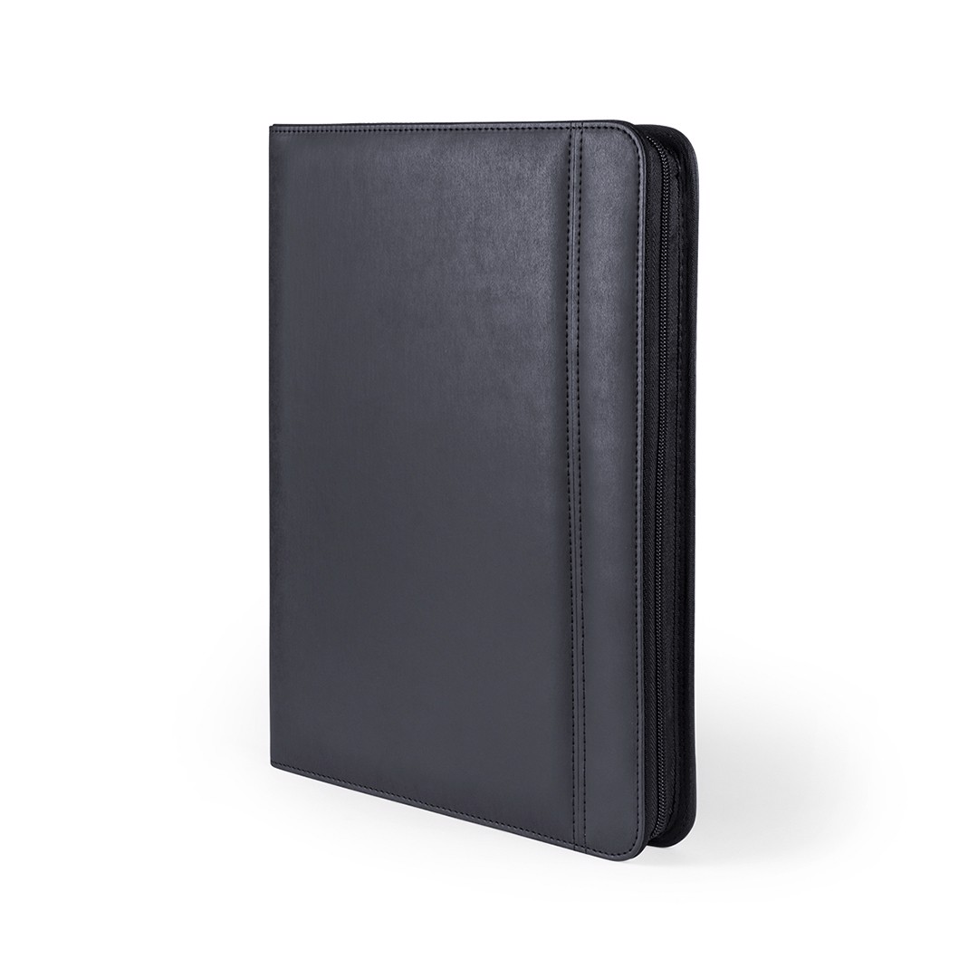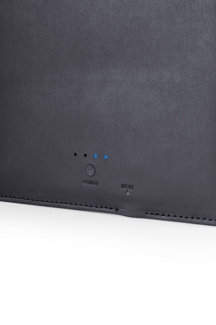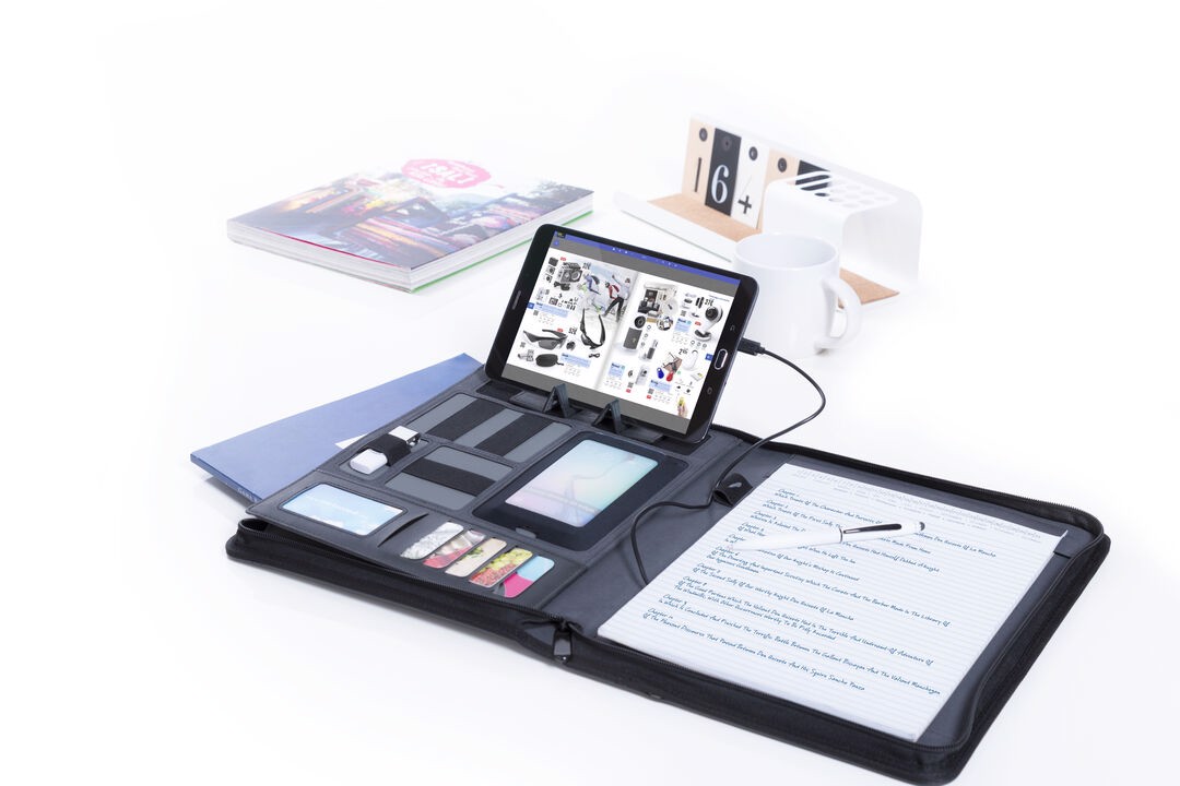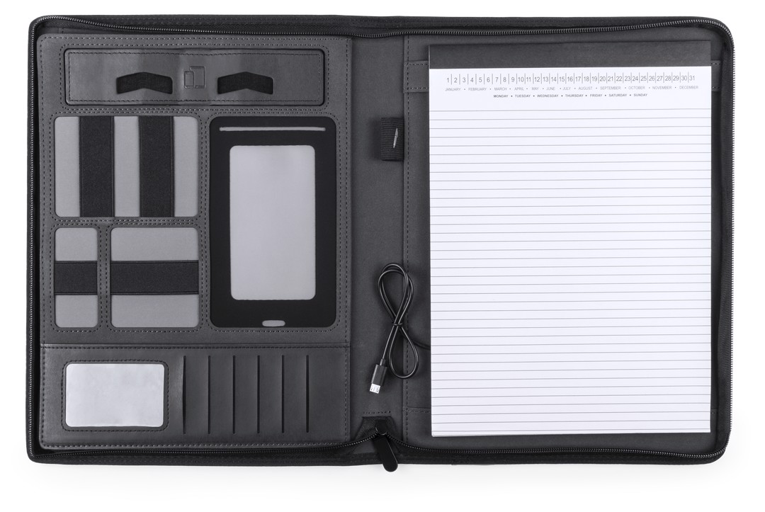 Stylish and soft black PU leather folder with a built-in, external auxiliary battery of high charge capacity -5,000 mAh-. In sober design and zipper opened, with plenty of storage compartments to store business cards, USB flash memories, plus a touch screen case for smartphones and LED charge indicators on the back of the folder. Includes a 20-page A4-size notepad and a tablet holder up to 9.7 inches. The easy access to the charging station via micro USB cable - included- make of this folder the perfect gadget for business and studying. The capacities shown in all our external auxiliary batteries are real, all of them incorporating non-recycled, grade A batteries, with a service life of at least 500 charging cycles, and complying with CE regulations. In addition, they are manufactured according RoHS standards, and in compliance with the following safety requirements: Power bank overcharge protection system. Complete discharge protection system, which increases the durability of the pow