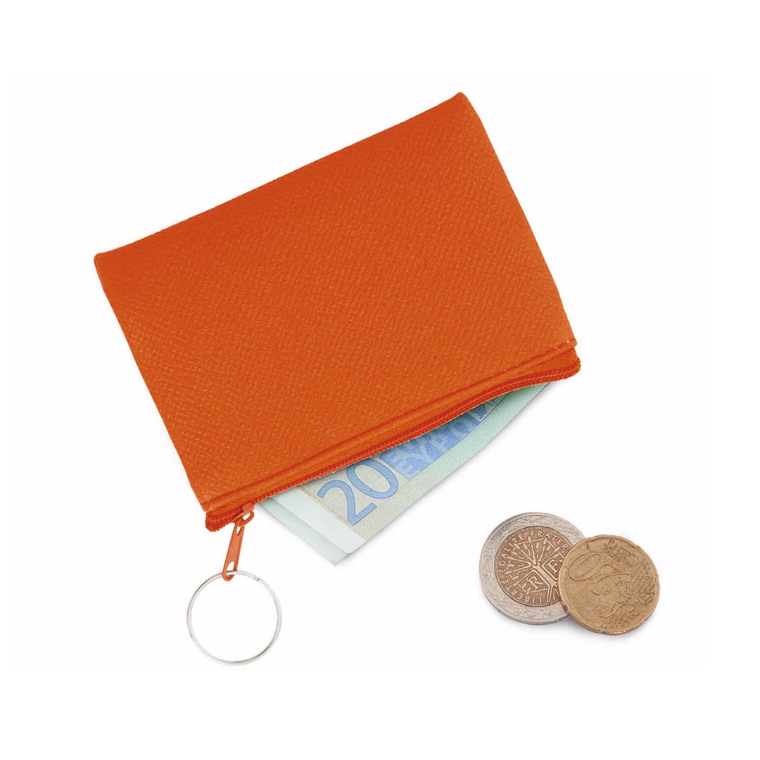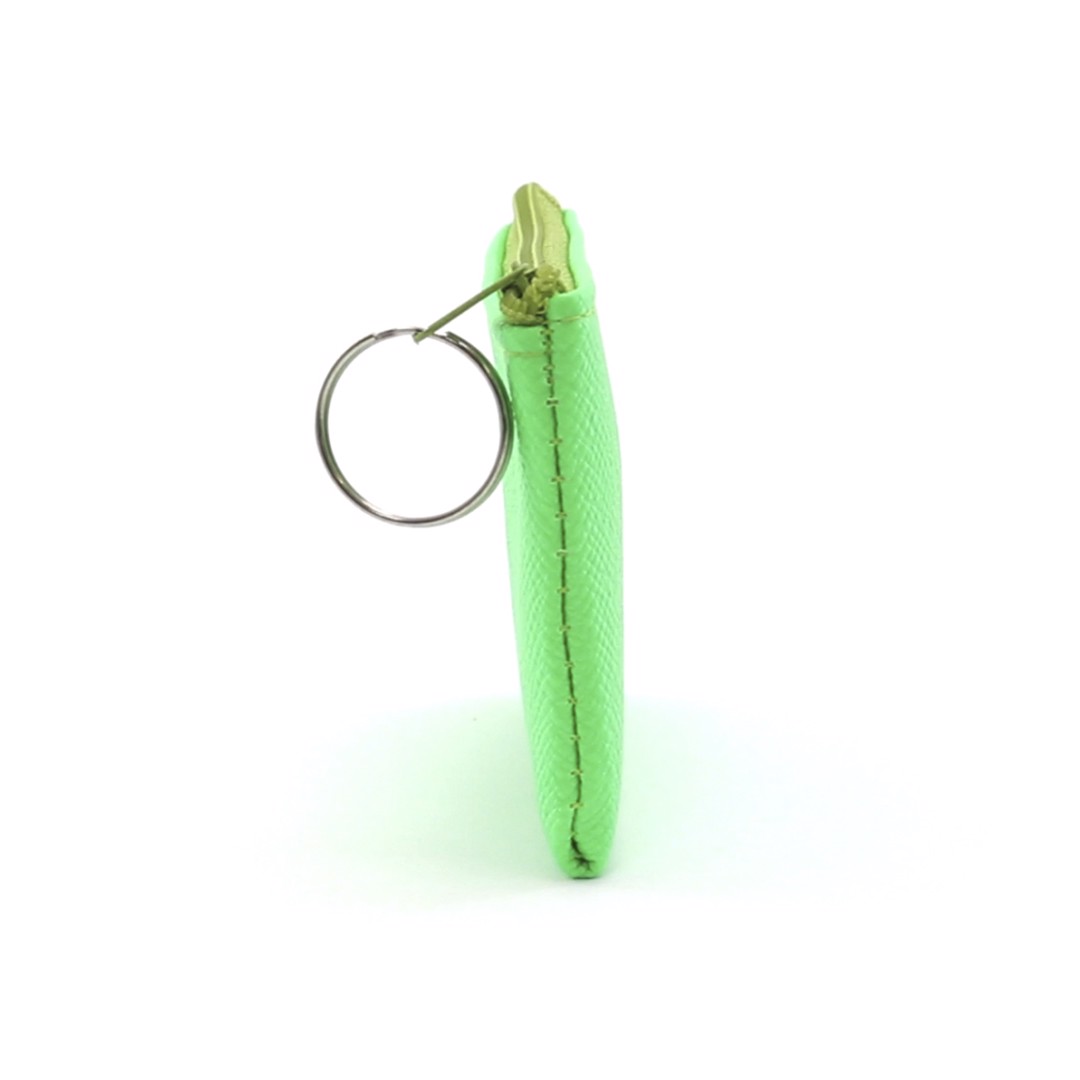 Square design coin purse with soft body in PVC in varied bright fluorescent colors. Main compartment with matching color zipperopening and carrying keychain.
